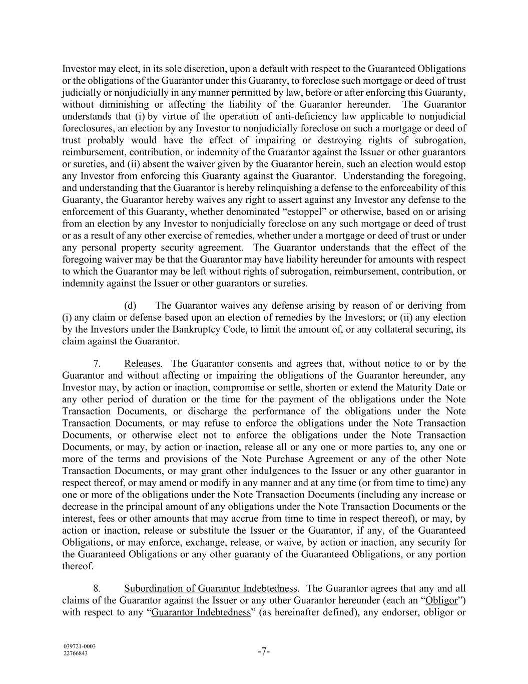 039721-0003 22766843 -7- Investor may elect, in its sole discretion, upon a default with respect to the Guaranteed Obligations or the obligations of the Guarantor under this Guaranty, to foreclose such mortgage or deed of trust judicially or nonjudicially in any manner permitted by law, before or after enforcing this Guaranty, without diminishing or affecting the liability of the Guarantor hereunder. The Guarantor understands that (i) by virtue of the operation of anti-deficiency law applicable to nonjudicial foreclosures, an election by any Investor to nonjudicially foreclose on such a mortgage or deed of trust probably would have the effect of impairing or destroying rights of subrogation, reimbursement, contribution, or indemnity of the Guarantor against the Issuer or other guarantors or sureties, and (ii) absent the waiver given by the Guarantor herein, such an election would estop any Investor from enforcing this Guaranty against the Guarantor. Understanding the foregoing, and understanding that the Guarantor is hereby relinquishing a defense to the enforceability of this Guaranty, the Guarantor hereby waives any right to assert against any Investor any defense to the enforcement of this Guaranty, whether denominated “estoppel” or otherwise, based on or arising from an election by any Investor to nonjudicially foreclose on any such mortgage or deed of trust or as a result of any other exercise of remedies, whether under a mortgage or deed of trust or under any personal property security agreement. The Guarantor understands that the effect of the foregoing waiver may be that the Guarantor may have liability hereunder for amounts with respect to which the Guarantor may be left without rights of subrogation, reimbursement, contribution, or indemnity against the Issuer or other guarantors or sureties. (d) The Guarantor waives any defense arising by reason of or deriving from (i) any claim or defense based upon an election of remedies by the Investors; or (ii) any election by the Investors under the Bankruptcy Code, to limit the amount of, or any collateral securing, its claim against the Guarantor. 7. Releases. The Guarantor consents and agrees that, without notice to or by the Guarantor and without affecting or impairing the obligations of the Guarantor hereunder, any Investor may, by action or inaction, compromise or settle, shorten or extend the Maturity Date or any other period of duration or the time for the payment of the obligations under the Note Transaction Documents, or discharge the performance of the obligations under the Note Transaction Documents, or may refuse to enforce the obligations under the Note Transaction Documents, or otherwise elect not to enforce the obligations under the Note Transaction Documents, or may, by action or inaction, release all or any one or more parties to, any one or more of the terms and provisions of the Note Purchase Agreement or any of the other Note Transaction Documents, or may grant other indulgences to the Issuer or any other guarantor in respect thereof, or may amend or modify in any manner and at any time (or from time to time) any one or more of the obligations under the Note Transaction Documents (including any increase or decrease in the principal amount of any obligations under the Note Transaction Documents or the interest, fees or other amounts that may accrue from time to time in respect thereof), or may, by action or inaction, release or substitute the Issuer or the Guarantor, if any, of the Guaranteed Obligations, or may enforce, exchange, release, or waive, by action or inaction, any security for the Guaranteed Obligations or any other guaranty of the Guaranteed Obligations, or any portion thereof. 8. Subordination of Guarantor Indebtedness. The Guarantor agrees that any and all claims of the Guarantor against the Issuer or any other Guarantor hereunder (each an “Obligor”) with respect to any “Guarantor Indebtedness” (as hereinafter defined), any endorser, obligor or