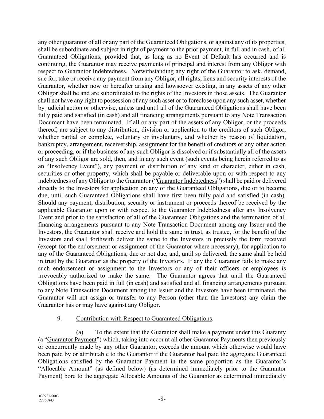 039721-0003 22766843 -8- any other guarantor of all or any part of the Guaranteed Obligations, or against any of its properties, shall be subordinate and subject in right of payment to the prior payment, in full and in cash, of all Guaranteed Obligations; provided that, as long as no Event of Default has occurred and is continuing, the Guarantor may receive payments of principal and interest from any Obligor with respect to Guarantor Indebtedness. Notwithstanding any right of the Guarantor to ask, demand, sue for, take or receive any payment from any Obligor, all rights, liens and security interests of the Guarantor, whether now or hereafter arising and howsoever existing, in any assets of any other Obligor shall be and are subordinated to the rights of the Investors in those assets. The Guarantor shall not have any right to possession of any such asset or to foreclose upon any such asset, whether by judicial action or otherwise, unless and until all of the Guaranteed Obligations shall have been fully paid and satisfied (in cash) and all financing arrangements pursuant to any Note Transaction Document have been terminated. If all or any part of the assets of any Obligor, or the proceeds thereof, are subject to any distribution, division or application to the creditors of such Obligor, whether partial or complete, voluntary or involuntary, and whether by reason of liquidation, bankruptcy, arrangement, receivership, assignment for the benefit of creditors or any other action or proceeding, or if the business of any such Obligor is dissolved or if substantially all of the assets of any such Obligor are sold, then, and in any such event (such events being herein referred to as an “Insolvency Event”), any payment or distribution of any kind or character, either in cash, securities or other property, which shall be payable or deliverable upon or with respect to any indebtedness of any Obligor to the Guarantor (“Guarantor Indebtedness”) shall be paid or delivered directly to the Investors for application on any of the Guaranteed Obligations, due or to become due, until such Guaranteed Obligations shall have first been fully paid and satisfied (in cash). Should any payment, distribution, security or instrument or proceeds thereof be received by the applicable Guarantor upon or with respect to the Guarantor Indebtedness after any Insolvency Event and prior to the satisfaction of all of the Guaranteed Obligations and the termination of all financing arrangements pursuant to any Note Transaction Document among any Issuer and the Investors, the Guarantor shall receive and hold the same in trust, as trustee, for the benefit of the Investors and shall forthwith deliver the same to the Investors in precisely the form received (except for the endorsement or assignment of the Guarantor where necessary), for application to any of the Guaranteed Obligations, due or not due, and, until so delivered, the same shall be held in trust by the Guarantor as the property of the Investors. If any the Guarantor fails to make any such endorsement or assignment to the Investors or any of their officers or employees is irrevocably authorized to make the same. The Guarantor agrees that until the Guaranteed Obligations have been paid in full (in cash) and satisfied and all financing arrangements pursuant to any Note Transaction Document among the Issuer and the Investors have been terminated, the Guarantor will not assign or transfer to any Person (other than the Investors) any claim the Guarantor has or may have against any Obligor. 9. Contribution with Respect to Guaranteed Obligations. (a) To the extent that the Guarantor shall make a payment under this Guaranty (a “Guarantor Payment”) which, taking into account all other Guarantor Payments then previously or concurrently made by any other Guarantor, exceeds the amount which otherwise would have been paid by or attributable to the Guarantor if the Guarantor had paid the aggregate Guaranteed Obligations satisfied by the Guarantor Payment in the same proportion as the Guarantor’s “Allocable Amount” (as defined below) (as determined immediately prior to the Guarantor Payment) bore to the aggregate Allocable Amounts of the Guarantor as determined immediately