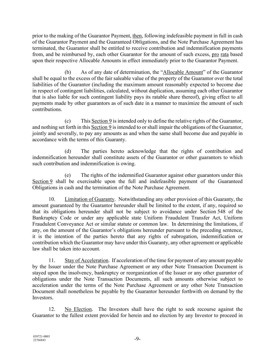 039721-0003 22766843 -9- prior to the making of the Guarantor Payment, then, following indefeasible payment in full in cash of the Guarantor Payment and the Guaranteed Obligations, and the Note Purchase Agreement has terminated, the Guarantor shall be entitled to receive contribution and indemnification payments from, and be reimbursed by, each other Guarantor for the amount of such excess, pro rata based upon their respective Allocable Amounts in effect immediately prior to the Guarantor Payment. (b) As of any date of determination, the “Allocable Amount” of the Guarantor shall be equal to the excess of the fair saleable value of the property of the Guarantor over the total liabilities of the Guarantor (including the maximum amount reasonably expected to become due in respect of contingent liabilities, calculated, without duplication, assuming each other Guarantor that is also liable for such contingent liability pays its ratable share thereof), giving effect to all payments made by other guarantors as of such date in a manner to maximize the amount of such contributions. (c) This Section 9 is intended only to define the relative rights of the Guarantor, and nothing set forth in this Section 9 is intended to or shall impair the obligations of the Guarantor, jointly and severally, to pay any amounts as and when the same shall become due and payable in accordance with the terms of this Guaranty. (d) The parties hereto acknowledge that the rights of contribution and indemnification hereunder shall constitute assets of the Guarantor or other guarantors to which such contribution and indemnification is owing. (e) The rights of the indemnified Guarantor against other guarantors under this Section 9 shall be exercisable upon the full and indefeasible payment of the Guaranteed Obligations in cash and the termination of the Note Purchase Agreement. 10. Limitation of Guaranty. Notwithstanding any other provision of this Guaranty, the amount guaranteed by the Guarantor hereunder shall be limited to the extent, if any, required so that its obligations hereunder shall not be subject to avoidance under Section 548 of the Bankruptcy Code or under any applicable state Uniform Fraudulent Transfer Act, Uniform Fraudulent Conveyance Act or similar statute or common law. In determining the limitations, if any, on the amount of the Guarantor’s obligations hereunder pursuant to the preceding sentence, it is the intention of the parties hereto that any rights of subrogation, indemnification or contribution which the Guarantor may have under this Guaranty, any other agreement or applicable law shall be taken into account. 11. Stay of Acceleration. If acceleration of the time for payment of any amount payable by the Issuer under the Note Purchase Agreement or any other Note Transaction Document is stayed upon the insolvency, bankruptcy or reorganization of the Issuer or any other guarantor of obligations under the Note Transaction Documents, all such amounts otherwise subject to acceleration under the terms of the Note Purchase Agreement or any other Note Transaction Document shall nonetheless be payable by the Guarantor hereunder forthwith on demand by the Investors. 12. No Election. The Investors shall have the right to seek recourse against the Guarantor to the fullest extent provided for herein and no election by any Investor to proceed in