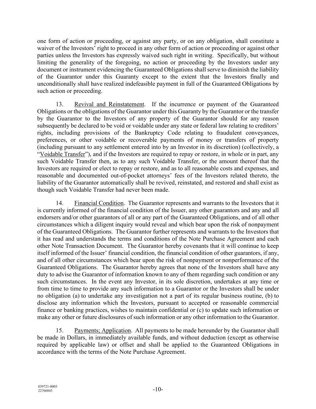 039721-0003 22766843 -10- one form of action or proceeding, or against any party, or on any obligation, shall constitute a waiver of the Investors’ right to proceed in any other form of action or proceeding or against other parties unless the Investors has expressly waived such right in writing. Specifically, but without limiting the generality of the foregoing, no action or proceeding by the Investors under any document or instrument evidencing the Guaranteed Obligations shall serve to diminish the liability of the Guarantor under this Guaranty except to the extent that the Investors finally and unconditionally shall have realized indefeasible payment in full of the Guaranteed Obligations by such action or proceeding. 13. Revival and Reinstatement. If the incurrence or payment of the Guaranteed Obligations or the obligations of the Guarantor under this Guaranty by the Guarantor or the transfer by the Guarantor to the Investors of any property of the Guarantor should for any reason subsequently be declared to be void or voidable under any state or federal law relating to creditors’ rights, including provisions of the Bankruptcy Code relating to fraudulent conveyances, preferences, or other voidable or recoverable payments of money or transfers of property (including pursuant to any settlement entered into by an Investor in its discretion) (collectively, a “Voidable Transfer”), and if the Investors are required to repay or restore, in whole or in part, any such Voidable Transfer then, as to any such Voidable Transfer, or the amount thereof that the Investors are required or elect to repay or restore, and as to all reasonable costs and expenses, and reasonable and documented out-of-pocket attorneys’ fees of the Investors related thereto, the liability of the Guarantor automatically shall be revived, reinstated, and restored and shall exist as though such Voidable Transfer had never been made. 14. Financial Condition. The Guarantor represents and warrants to the Investors that it is currently informed of the financial condition of the Issuer, any other guarantors and any and all endorsers and/or other guarantors of all or any part of the Guaranteed Obligations, and of all other circumstances which a diligent inquiry would reveal and which bear upon the risk of nonpayment of the Guaranteed Obligations. The Guarantor further represents and warrants to the Investors that it has read and understands the terms and conditions of the Note Purchase Agreement and each other Note Transaction Document. The Guarantor hereby covenants that it will continue to keep itself informed of the Issuer’ financial condition, the financial condition of other guarantors, if any, and of all other circumstances which bear upon the risk of nonpayment or nonperformance of the Guaranteed Obligations. The Guarantor hereby agrees that none of the Investors shall have any duty to advise the Guarantor of information known to any of them regarding such condition or any such circumstances. In the event any Investor, in its sole discretion, undertakes at any time or from time to time to provide any such information to a Guarantor or the Investors shall be under no obligation (a) to undertake any investigation not a part of its regular business routine, (b) to disclose any information which the Investors, pursuant to accepted or reasonable commercial finance or banking practices, wishes to maintain confidential or (c) to update such information or make any other or future disclosures of such information or any other information to the Guarantor. 15. Payments; Application. All payments to be made hereunder by the Guarantor shall be made in Dollars, in immediately available funds, and without deduction (except as otherwise required by applicable law) or offset and shall be applied to the Guaranteed Obligations in accordance with the terms of the Note Purchase Agreement.