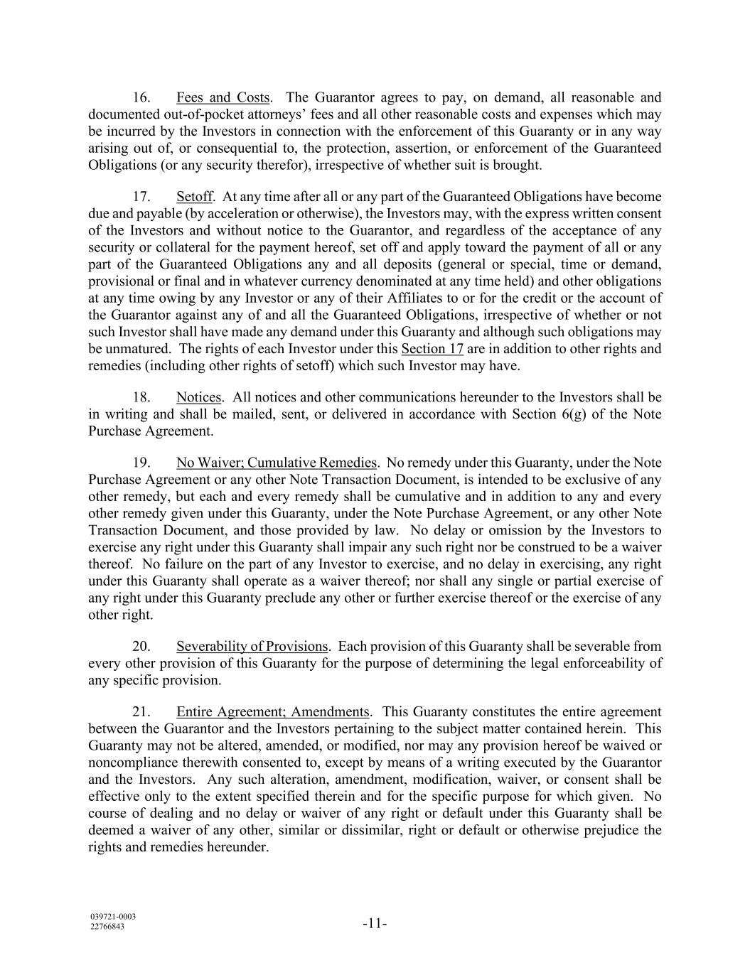 039721-0003 22766843 -11- 16. Fees and Costs. The Guarantor agrees to pay, on demand, all reasonable and documented out-of-pocket attorneys’ fees and all other reasonable costs and expenses which may be incurred by the Investors in connection with the enforcement of this Guaranty or in any way arising out of, or consequential to, the protection, assertion, or enforcement of the Guaranteed Obligations (or any security therefor), irrespective of whether suit is brought. 17. Setoff. At any time after all or any part of the Guaranteed Obligations have become due and payable (by acceleration or otherwise), the Investors may, with the express written consent of the Investors and without notice to the Guarantor, and regardless of the acceptance of any security or collateral for the payment hereof, set off and apply toward the payment of all or any part of the Guaranteed Obligations any and all deposits (general or special, time or demand, provisional or final and in whatever currency denominated at any time held) and other obligations at any time owing by any Investor or any of their Affiliates to or for the credit or the account of the Guarantor against any of and all the Guaranteed Obligations, irrespective of whether or not such Investor shall have made any demand under this Guaranty and although such obligations may be unmatured. The rights of each Investor under this Section 17 are in addition to other rights and remedies (including other rights of setoff) which such Investor may have. 18. Notices. All notices and other communications hereunder to the Investors shall be in writing and shall be mailed, sent, or delivered in accordance with Section 6(g) of the Note Purchase Agreement. 19. No Waiver; Cumulative Remedies. No remedy under this Guaranty, under the Note Purchase Agreement or any other Note Transaction Document, is intended to be exclusive of any other remedy, but each and every remedy shall be cumulative and in addition to any and every other remedy given under this Guaranty, under the Note Purchase Agreement, or any other Note Transaction Document, and those provided by law. No delay or omission by the Investors to exercise any right under this Guaranty shall impair any such right nor be construed to be a waiver thereof. No failure on the part of any Investor to exercise, and no delay in exercising, any right under this Guaranty shall operate as a waiver thereof; nor shall any single or partial exercise of any right under this Guaranty preclude any other or further exercise thereof or the exercise of any other right. 20. Severability of Provisions. Each provision of this Guaranty shall be severable from every other provision of this Guaranty for the purpose of determining the legal enforceability of any specific provision. 21. Entire Agreement; Amendments. This Guaranty constitutes the entire agreement between the Guarantor and the Investors pertaining to the subject matter contained herein. This Guaranty may not be altered, amended, or modified, nor may any provision hereof be waived or noncompliance therewith consented to, except by means of a writing executed by the Guarantor and the Investors. Any such alteration, amendment, modification, waiver, or consent shall be effective only to the extent specified therein and for the specific purpose for which given. No course of dealing and no delay or waiver of any right or default under this Guaranty shall be deemed a waiver of any other, similar or dissimilar, right or default or otherwise prejudice the rights and remedies hereunder.
