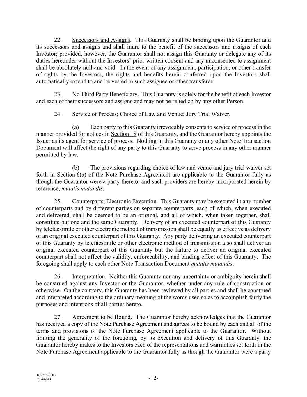 039721-0003 22766843 -12- 22. Successors and Assigns. This Guaranty shall be binding upon the Guarantor and its successors and assigns and shall inure to the benefit of the successors and assigns of each Investor; provided, however, the Guarantor shall not assign this Guaranty or delegate any of its duties hereunder without the Investors’ prior written consent and any unconsented to assignment shall be absolutely null and void. In the event of any assignment, participation, or other transfer of rights by the Investors, the rights and benefits herein conferred upon the Investors shall automatically extend to and be vested in such assignee or other transferee. 23. No Third Party Beneficiary. This Guaranty is solely for the benefit of each Investor and each of their successors and assigns and may not be relied on by any other Person. 24. Service of Process; Choice of Law and Venue; Jury Trial Waiver. (a) Each party to this Guaranty irrevocably consents to service of process in the manner provided for notices in Section 18 of this Guaranty, and the Guarantor hereby appoints the Issuer as its agent for service of process. Nothing in this Guaranty or any other Note Transaction Document will affect the right of any party to this Guaranty to serve process in any other manner permitted by law. (b) The provisions regarding choice of law and venue and jury trial waiver set forth in Section 6(a) of the Note Purchase Agreement are applicable to the Guarantor fully as though the Guarantor were a party thereto, and such providers are hereby incorporated herein by reference, mutatis mutandis. 25. Counterparts; Electronic Execution. This Guaranty may be executed in any number of counterparts and by different parties on separate counterparts, each of which, when executed and delivered, shall be deemed to be an original, and all of which, when taken together, shall constitute but one and the same Guaranty. Delivery of an executed counterpart of this Guaranty by telefacsimile or other electronic method of transmission shall be equally as effective as delivery of an original executed counterpart of this Guaranty. Any party delivering an executed counterpart of this Guaranty by telefacsimile or other electronic method of transmission also shall deliver an original executed counterpart of this Guaranty but the failure to deliver an original executed counterpart shall not affect the validity, enforceability, and binding effect of this Guaranty. The foregoing shall apply to each other Note Transaction Document mutatis mutandis. 26. Interpretation. Neither this Guaranty nor any uncertainty or ambiguity herein shall be construed against any Investor or the Guarantor, whether under any rule of construction or otherwise. On the contrary, this Guaranty has been reviewed by all parties and shall be construed and interpreted according to the ordinary meaning of the words used so as to accomplish fairly the purposes and intentions of all parties hereto. 27. Agreement to be Bound. The Guarantor hereby acknowledges that the Guarantor has received a copy of the Note Purchase Agreement and agrees to be bound by each and all of the terms and provisions of the Note Purchase Agreement applicable to the Guarantor. Without limiting the generality of the foregoing, by its execution and delivery of this Guaranty, the Guarantor hereby makes to the Investors each of the representations and warranties set forth in the Note Purchase Agreement applicable to the Guarantor fully as though the Guarantor were a party