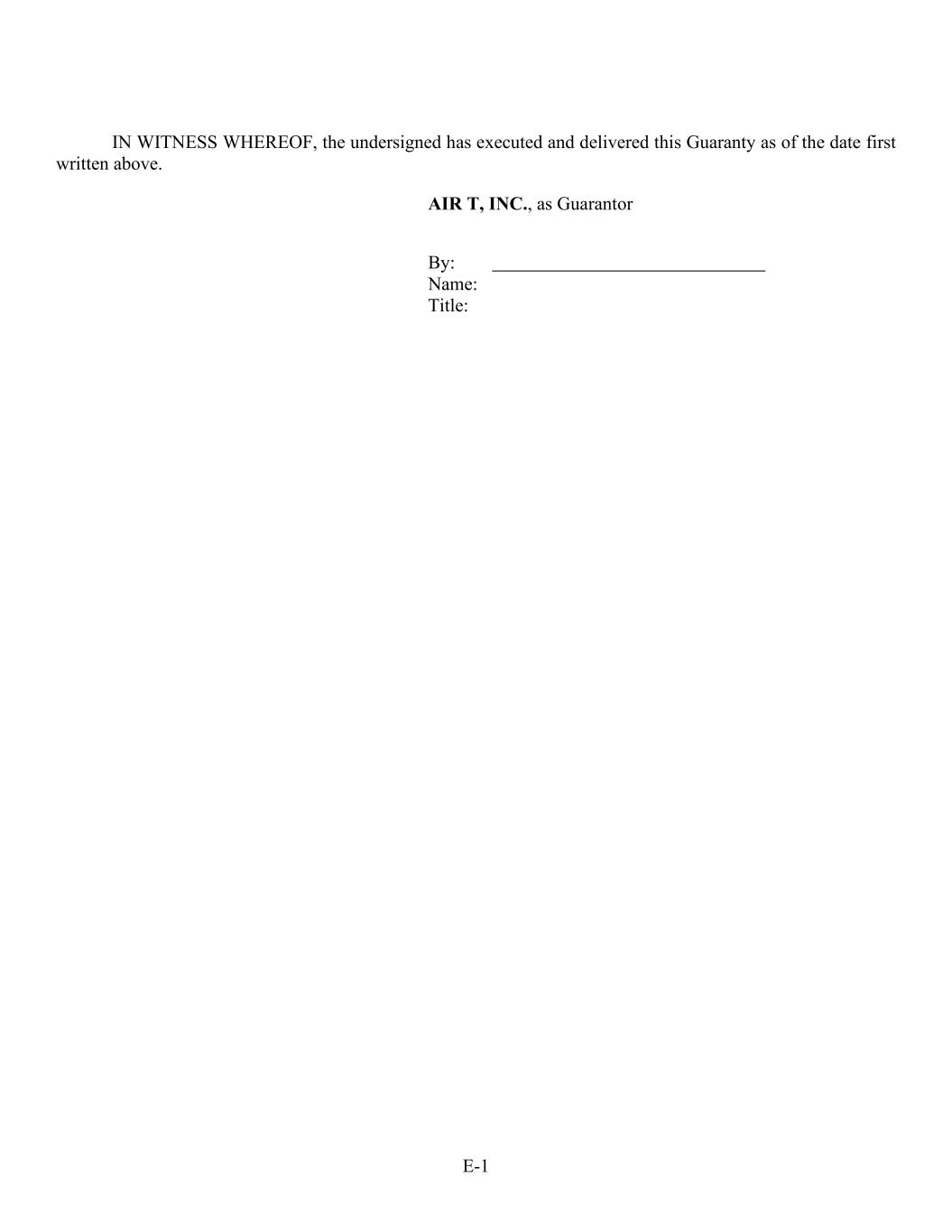 E-1 IN WITNESS WHEREOF, the undersigned has executed and delivered this Guaranty as of the date first written above. AIR T, INC., as Guarantor By: Name: Title: