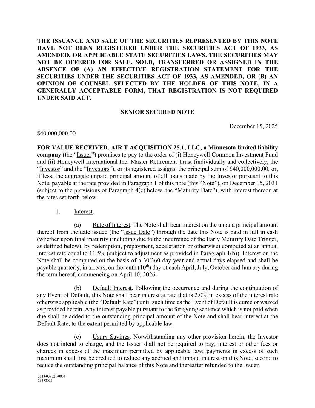 3113/039721-0003 23152022 THE ISSUANCE AND SALE OF THE SECURITIES REPRESENTED BY THIS NOTE HAVE NOT BEEN REGISTERED UNDER THE SECURITIES ACT OF 1933, AS AMENDED, OR APPLICABLE STATE SECURITIES LAWS. THE SECURITIES MAY NOT BE OFFERED FOR SALE, SOLD, TRANSFERRED OR ASSIGNED IN THE ABSENCE OF (A) AN EFFECTIVE REGISTRATION STATEMENT FOR THE SECURITIES UNDER THE SECURITIES ACT OF 1933, AS AMENDED, OR (B) AN OPINION OF COUNSEL SELECTED BY THE HOLDER OF THIS NOTE, IN A GENERALLY ACCEPTABLE FORM, THAT REGISTRATION IS NOT REQUIRED UNDER SAID ACT. SENIOR SECURED NOTE December 15, 2025 $40,000,000.00 FOR VALUE RECEIVED, AIR T ACQUISITION 25.1, LLC, a Minnesota limited liability company (the “Issuer”) promises to pay to the order of (i) Honeywell Common Investment Fund and (ii) Honeywell International Inc. Master Retirement Trust (individually and collectively, the “Investor” and the “Investors”), or its registered assigns, the principal sum of $40,000,000.00, or, if less, the aggregate unpaid principal amount of all loans made by the Investor pursuant to this Note, payable at the rate provided in Paragraph 1 of this note (this “Note”), on December 15, 2031 (subject to the provisions of Paragraph 4(e) below, the “Maturity Date”), with interest thereon at the rates set forth below. 1. Interest. (a) Rate of Interest. The Note shall bear interest on the unpaid principal amount thereof from the date issued (the “Issue Date”) through the date this Note is paid in full in cash (whether upon final maturity (including due to the incurrence of the Early Maturity Date Trigger, as defined below), by redemption, prepayment, acceleration or otherwise) computed at an annual interest rate equal to 11.5% (subject to adjustment as provided in Paragraph 1(b)). Interest on the Note shall be computed on the basis of a 30/360-day year and actual days elapsed and shall be payable quarterly, in arrears, on the tenth (10th) day of each April, July, October and January during the term hereof, commencing on April 10, 2026. (b) Default Interest. Following the occurrence and during the continuation of any Event of Default, this Note shall bear interest at rate that is 2.0% in excess of the interest rate otherwise applicable (the “Default Rate”) until such time as the Event of Default is cured or waived as provided herein. Any interest payable pursuant to the foregoing sentence which is not paid when due shall be added to the outstanding principal amount of the Note and shall bear interest at the Default Rate, to the extent permitted by applicable law. (c) Usury Savings. Notwithstanding any other provision herein, the Investor does not intend to charge, and the Issuer shall not be required to pay, interest or other fees or charges in excess of the maximum permitted by applicable law; payments in excess of such maximum shall first be credited to reduce any accrued and unpaid interest on this Note, second to reduce the outstanding principal balance of this Note and thereafter refunded to the Issuer.