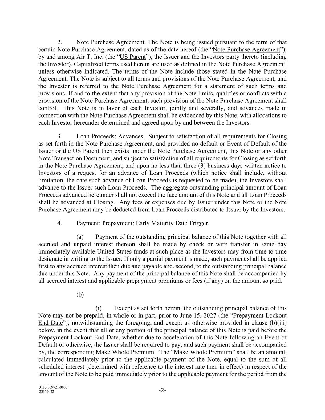 3113/039721-0003 23152022 -2- 2. Note Purchase Agreement. The Note is being issued pursuant to the term of that certain Note Purchase Agreement, dated as of the date hereof (the “Note Purchase Agreement”), by and among Air T, Inc. (the “US Parent”), the Issuer and the Investors party thereto (including the Investor). Capitalized terms used herein are used as defined in the Note Purchase Agreement, unless otherwise indicated. The terms of the Note include those stated in the Note Purchase Agreement. The Note is subject to all terms and provisions of the Note Purchase Agreement, and the Investor is referred to the Note Purchase Agreement for a statement of such terms and provisions. If and to the extent that any provision of the Note limits, qualifies or conflicts with a provision of the Note Purchase Agreement, such provision of the Note Purchase Agreement shall control. This Note is in favor of each Investor, jointly and severally, and advances made in connection with the Note Purchase Agreement shall be evidenced by this Note, with allocations to each Investor hereunder determined and agreed upon by and between the Investors. 3. Loan Proceeds; Advances. Subject to satisfaction of all requirements for Closing as set forth in the Note Purchase Agreement, and provided no default or Event of Default of the Issuer or the US Parent then exists under the Note Purchase Agreement, this Note or any other Note Transaction Document, and subject to satisfaction of all requirements for Closing as set forth in the Note Purchase Agreement, and upon no less than three (3) business days written notice to Investors of a request for an advance of Loan Proceeds (which notice shall include, without limitation, the date such advance of Loan Proceeds is requested to be made), the Investors shall advance to the Issuer such Loan Proceeds. The aggregate outstanding principal amount of Loan Proceeds advanced hereunder shall not exceed the face amount of this Note and all Loan Proceeds shall be advanced at Closing. Any fees or expenses due by Issuer under this Note or the Note Purchase Agreement may be deducted from Loan Proceeds distributed to Issuer by the Investors. 4. Payment; Prepayment; Early Maturity Date Trigger. (a) Payment of the outstanding principal balance of this Note together with all accrued and unpaid interest thereon shall be made by check or wire transfer in same day immediately available United States funds at such place as the Investors may from time to time designate in writing to the Issuer. If only a partial payment is made, such payment shall be applied first to any accrued interest then due and payable and. second, to the outstanding principal balance due under this Note. Any payment of the principal balance of this Note shall be accompanied by all accrued interest and applicable prepayment premiums or fees (if any) on the amount so paid. (b) (i) Except as set forth herein, the outstanding principal balance of this Note may not be prepaid, in whole or in part, prior to June 15, 2027 (the “Prepayment Lockout End Date”); notwithstanding the foregoing, and except as otherwise provided in clause (b)(iii) below, in the event that all or any portion of the principal balance of this Note is paid before the Prepayment Lockout End Date, whether due to acceleration of this Note following an Event of Default or otherwise, the Issuer shall be required to pay, and such payment shall be accompanied by, the corresponding Make Whole Premium. The “Make Whole Premium” shall be an amount, calculated immediately prior to the applicable payment of the Note, equal to the sum of all scheduled interest (determined with reference to the interest rate then in effect) in respect of the amount of the Note to be paid immediately prior to the applicable payment for the period from the