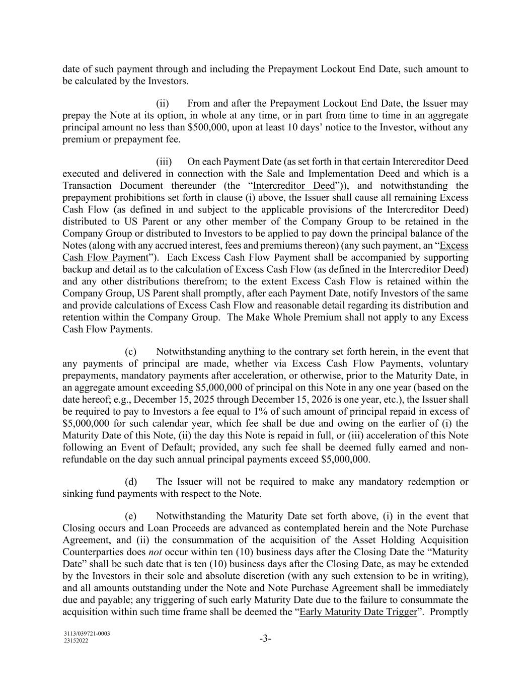 3113/039721-0003 23152022 -3- date of such payment through and including the Prepayment Lockout End Date, such amount to be calculated by the Investors. (ii) From and after the Prepayment Lockout End Date, the Issuer may prepay the Note at its option, in whole at any time, or in part from time to time in an aggregate principal amount no less than $500,000, upon at least 10 days’ notice to the Investor, without any premium or prepayment fee. (iii) On each Payment Date (as set forth in that certain Intercreditor Deed executed and delivered in connection with the Sale and Implementation Deed and which is a Transaction Document thereunder (the “Intercreditor Deed”)), and notwithstanding the prepayment prohibitions set forth in clause (i) above, the Issuer shall cause all remaining Excess Cash Flow (as defined in and subject to the applicable provisions of the Intercreditor Deed) distributed to US Parent or any other member of the Company Group to be retained in the Company Group or distributed to Investors to be applied to pay down the principal balance of the Notes (along with any accrued interest, fees and premiums thereon) (any such payment, an “Excess Cash Flow Payment”). Each Excess Cash Flow Payment shall be accompanied by supporting backup and detail as to the calculation of Excess Cash Flow (as defined in the Intercreditor Deed) and any other distributions therefrom; to the extent Excess Cash Flow is retained within the Company Group, US Parent shall promptly, after each Payment Date, notify Investors of the same and provide calculations of Excess Cash Flow and reasonable detail regarding its distribution and retention within the Company Group. The Make Whole Premium shall not apply to any Excess Cash Flow Payments. (c) Notwithstanding anything to the contrary set forth herein, in the event that any payments of principal are made, whether via Excess Cash Flow Payments, voluntary prepayments, mandatory payments after acceleration, or otherwise, prior to the Maturity Date, in an aggregate amount exceeding $5,000,000 of principal on this Note in any one year (based on the date hereof; e.g., December 15, 2025 through December 15, 2026 is one year, etc.), the Issuer shall be required to pay to Investors a fee equal to 1% of such amount of principal repaid in excess of $5,000,000 for such calendar year, which fee shall be due and owing on the earlier of (i) the Maturity Date of this Note, (ii) the day this Note is repaid in full, or (iii) acceleration of this Note following an Event of Default; provided, any such fee shall be deemed fully earned and non- refundable on the day such annual principal payments exceed $5,000,000. (d) The Issuer will not be required to make any mandatory redemption or sinking fund payments with respect to the Note. (e) Notwithstanding the Maturity Date set forth above, (i) in the event that Closing occurs and Loan Proceeds are advanced as contemplated herein and the Note Purchase Agreement, and (ii) the consummation of the acquisition of the Asset Holding Acquisition Counterparties does not occur within ten (10) business days after the Closing Date the “Maturity Date” shall be such date that is ten (10) business days after the Closing Date, as may be extended by the Investors in their sole and absolute discretion (with any such extension to be in writing), and all amounts outstanding under the Note and Note Purchase Agreement shall be immediately due and payable; any triggering of such early Maturity Date due to the failure to consummate the acquisition within such time frame shall be deemed the “Early Maturity Date Trigger”. Promptly