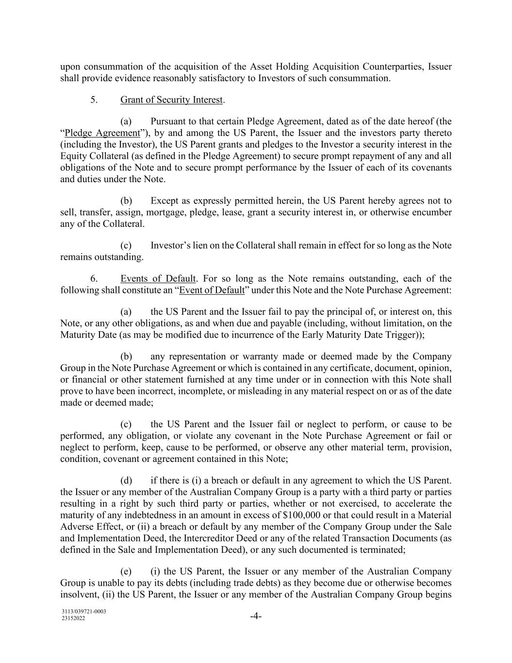 3113/039721-0003 23152022 -4- upon consummation of the acquisition of the Asset Holding Acquisition Counterparties, Issuer shall provide evidence reasonably satisfactory to Investors of such consummation. 5. Grant of Security Interest. (a) Pursuant to that certain Pledge Agreement, dated as of the date hereof (the “Pledge Agreement”), by and among the US Parent, the Issuer and the investors party thereto (including the Investor), the US Parent grants and pledges to the Investor a security interest in the Equity Collateral (as defined in the Pledge Agreement) to secure prompt repayment of any and all obligations of the Note and to secure prompt performance by the Issuer of each of its covenants and duties under the Note. (b) Except as expressly permitted herein, the US Parent hereby agrees not to sell, transfer, assign, mortgage, pledge, lease, grant a security interest in, or otherwise encumber any of the Collateral. (c) Investor’s lien on the Collateral shall remain in effect for so long as the Note remains outstanding. 6. Events of Default. For so long as the Note remains outstanding, each of the following shall constitute an “Event of Default” under this Note and the Note Purchase Agreement: (a) the US Parent and the Issuer fail to pay the principal of, or interest on, this Note, or any other obligations, as and when due and payable (including, without limitation, on the Maturity Date (as may be modified due to incurrence of the Early Maturity Date Trigger)); (b) any representation or warranty made or deemed made by the Company Group in the Note Purchase Agreement or which is contained in any certificate, document, opinion, or financial or other statement furnished at any time under or in connection with this Note shall prove to have been incorrect, incomplete, or misleading in any material respect on or as of the date made or deemed made; (c) the US Parent and the Issuer fail or neglect to perform, or cause to be performed, any obligation, or violate any covenant in the Note Purchase Agreement or fail or neglect to perform, keep, cause to be performed, or observe any other material term, provision, condition, covenant or agreement contained in this Note; (d) if there is (i) a breach or default in any agreement to which the US Parent. the Issuer or any member of the Australian Company Group is a party with a third party or parties resulting in a right by such third party or parties, whether or not exercised, to accelerate the maturity of any indebtedness in an amount in excess of $100,000 or that could result in a Material Adverse Effect, or (ii) a breach or default by any member of the Company Group under the Sale and Implementation Deed, the Intercreditor Deed or any of the related Transaction Documents (as defined in the Sale and Implementation Deed), or any such documented is terminated; (e) (i) the US Parent, the Issuer or any member of the Australian Company Group is unable to pay its debts (including trade debts) as they become due or otherwise becomes insolvent, (ii) the US Parent, the Issuer or any member of the Australian Company Group begins