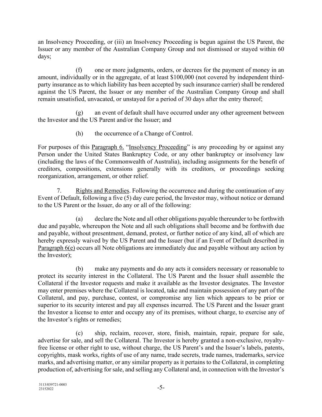 3113/039721-0003 23152022 -5- an Insolvency Proceeding, or (iii) an Insolvency Proceeding is begun against the US Parent, the Issuer or any member of the Australian Company Group and not dismissed or stayed within 60 days; (f) one or more judgments, orders, or decrees for the payment of money in an amount, individually or in the aggregate, of at least $100,000 (not covered by independent third- party insurance as to which liability has been accepted by such insurance carrier) shall be rendered against the US Parent, the Issuer or any member of the Australian Company Group and shall remain unsatisfied, unvacated, or unstayed for a period of 30 days after the entry thereof; (g) an event of default shall have occurred under any other agreement between the Investor and the US Parent and/or the Issuer; and (h) the occurrence of a Change of Control. For purposes of this Paragraph 6. “Insolvency Proceeding” is any proceeding by or against any Person under the United States Bankruptcy Code, or any other bankruptcy or insolvency law (including the laws of the Commonwealth of Australia), including assignments for the benefit of creditors, compositions, extensions generally with its creditors, or proceedings seeking reorganization, arrangement, or other relief. 7. Rights and Remedies. Following the occurrence and during the continuation of any Event of Default, following a five (5) day cure period, the Investor may, without notice or demand to the US Parent or the Issuer, do any or all of the following: (a) declare the Note and all other obligations payable thereunder to be forthwith due and payable, whereupon the Note and all such obligations shall become and be forthwith due and payable, without presentment, demand, protest, or further notice of any kind, all of which are hereby expressly waived by the US Parent and the Issuer (but if an Event of Default described in Paragraph 6(e) occurs all Note obligations are immediately due and payable without any action by the Investor); (b) make any payments and do any acts it considers necessary or reasonable to protect its security interest in the Collateral. The US Parent and the Issuer shall assemble the Collateral if the Investor requests and make it available as the Investor designates. The Investor may enter premises where the Collateral is located, take and maintain possession of any part of the Collateral, and pay, purchase, contest, or compromise any lien which appears to be prior or superior to its security interest and pay all expenses incurred. The US Parent and the Issuer grant the Investor a license to enter and occupy any of its premises, without charge, to exercise any of the Investor’s rights or remedies; (c) ship, reclaim, recover, store, finish, maintain, repair, prepare for sale, advertise for sale, and sell the Collateral. The Investor is hereby granted a non-exclusive, royalty- free license or other right to use, without charge, the US Parent’s and the Issuer’s labels, patents, copyrights, mask works, rights of use of any name, trade secrets, trade names, trademarks, service marks, and advertising matter, or any similar property as it pertains to the Collateral, in completing production of, advertising for sale, and selling any Collateral and, in connection with the Investor’s