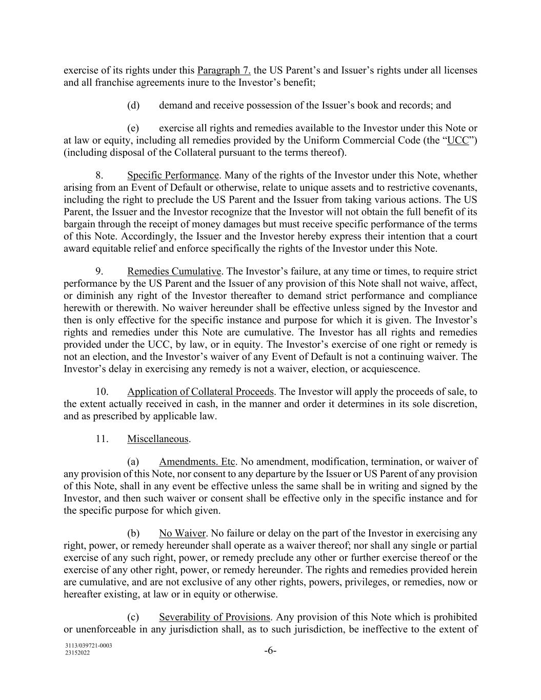 3113/039721-0003 23152022 -6- exercise of its rights under this Paragraph 7. the US Parent’s and Issuer’s rights under all licenses and all franchise agreements inure to the Investor’s benefit; (d) demand and receive possession of the Issuer’s book and records; and (e) exercise all rights and remedies available to the Investor under this Note or at law or equity, including all remedies provided by the Uniform Commercial Code (the “UCC”) (including disposal of the Collateral pursuant to the terms thereof). 8. Specific Performance. Many of the rights of the Investor under this Note, whether arising from an Event of Default or otherwise, relate to unique assets and to restrictive covenants, including the right to preclude the US Parent and the Issuer from taking various actions. The US Parent, the Issuer and the Investor recognize that the Investor will not obtain the full benefit of its bargain through the receipt of money damages but must receive specific performance of the terms of this Note. Accordingly, the Issuer and the Investor hereby express their intention that a court award equitable relief and enforce specifically the rights of the Investor under this Note. 9. Remedies Cumulative. The Investor’s failure, at any time or times, to require strict performance by the US Parent and the Issuer of any provision of this Note shall not waive, affect, or diminish any right of the Investor thereafter to demand strict performance and compliance herewith or therewith. No waiver hereunder shall be effective unless signed by the Investor and then is only effective for the specific instance and purpose for which it is given. The Investor’s rights and remedies under this Note are cumulative. The Investor has all rights and remedies provided under the UCC, by law, or in equity. The Investor’s exercise of one right or remedy is not an election, and the Investor’s waiver of any Event of Default is not a continuing waiver. The Investor’s delay in exercising any remedy is not a waiver, election, or acquiescence. 10. Application of Collateral Proceeds. The Investor will apply the proceeds of sale, to the extent actually received in cash, in the manner and order it determines in its sole discretion, and as prescribed by applicable law. 11. Miscellaneous. (a) Amendments. Etc. No amendment, modification, termination, or waiver of any provision of this Note, nor consent to any departure by the Issuer or US Parent of any provision of this Note, shall in any event be effective unless the same shall be in writing and signed by the Investor, and then such waiver or consent shall be effective only in the specific instance and for the specific purpose for which given. (b) No Waiver. No failure or delay on the part of the Investor in exercising any right, power, or remedy hereunder shall operate as a waiver thereof; nor shall any single or partial exercise of any such right, power, or remedy preclude any other or further exercise thereof or the exercise of any other right, power, or remedy hereunder. The rights and remedies provided herein are cumulative, and are not exclusive of any other rights, powers, privileges, or remedies, now or hereafter existing, at law or in equity or otherwise. (c) Severability of Provisions. Any provision of this Note which is prohibited or unenforceable in any jurisdiction shall, as to such jurisdiction, be ineffective to the extent of