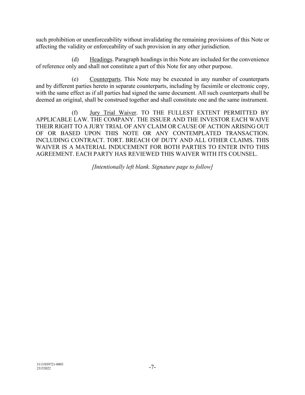 3113/039721-0003 23152022 -7- such prohibition or unenforceability without invalidating the remaining provisions of this Note or affecting the validity or enforceability of such provision in any other jurisdiction. (d) Headings. Paragraph headings in this Note are included for the convenience of reference only and shall not constitute a part of this Note for any other purpose. (e) Counterparts. This Note may be executed in any number of counterparts and by different parties hereto in separate counterparts, including by facsimile or electronic copy, with the same effect as if all parties had signed the same document. All such counterparts shall be deemed an original, shall be construed together and shall constitute one and the same instrument. (f) Jury Trial Waiver. TO THE FULLEST EXTENT PERMITTED BY APPLICABLE LAW. THE COMPANY. THE ISSUER AND THE INVESTOR EACH WAIVE THEIR RIGHT TO A JURY TRIAL OF ANY CLAIM OR CAUSE OF ACTION ARISING OUT OF OR BASED UPON THIS NOTE OR ANY CONTEMPLATED TRANSACTION. INCLUDING CONTRACT. TORT. BREACH OF DUTY AND ALL OTHER CLAIMS. THIS WAIVER IS A MATERIAL INDUCEMENT FOR BOTH PARTIES TO ENTER INTO THIS AGREEMENT. EACH PARTY HAS REVIEWED THIS WAIVER WITH ITS COUNSEL. [Intentionally left blank. Signature page to follow]