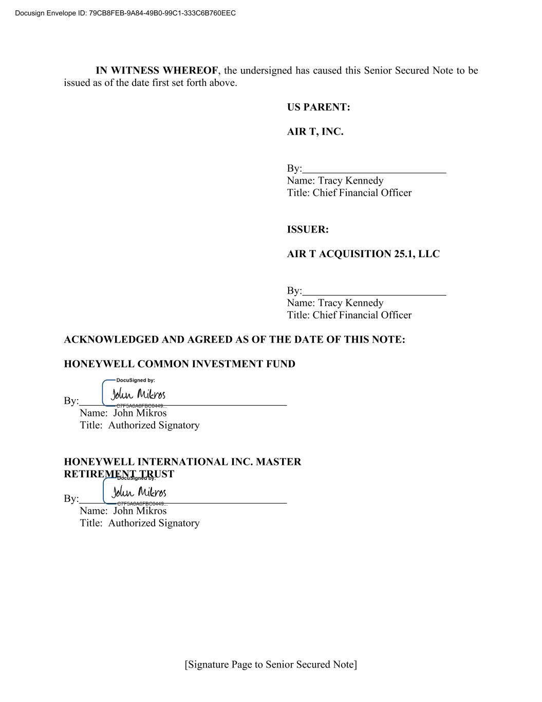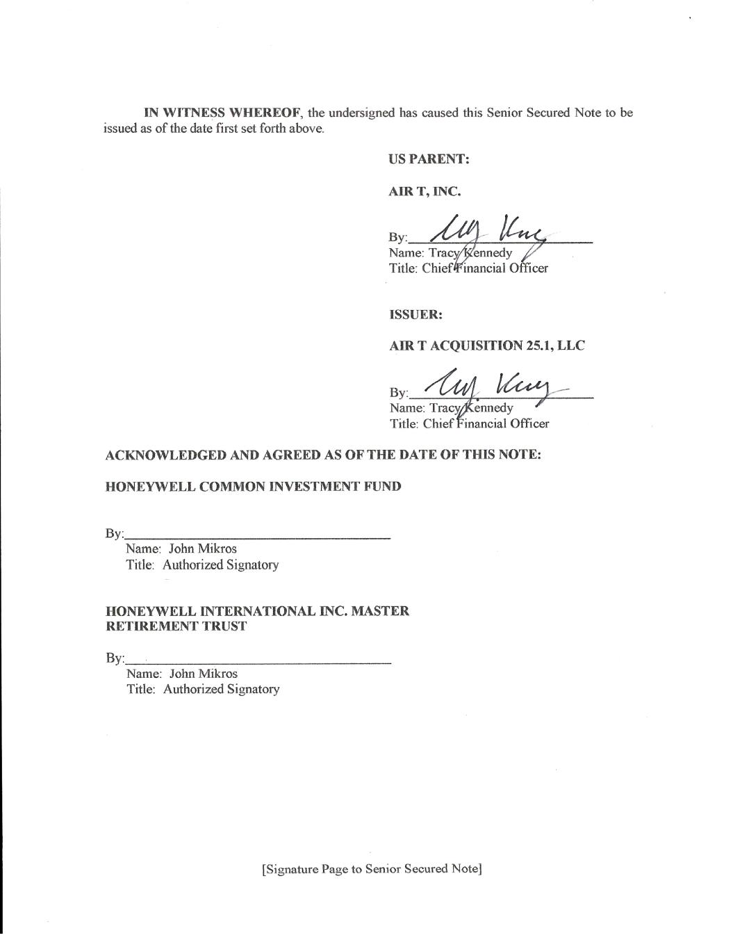 [Signature Page to Senior Secured Note] IN WITNESS WHEREOF, the undersigned has caused this Senior Secured Note to be issued as of the date first set forth above. US PARENT: AIR T, INC. By: Name: Tracy Kennedy Title: Chief Financial Officer ISSUER: AIR T ACQUISITION 25.1, LLC By: Name: Tracy Kennedy Title: Chief Financial Officer ACKNOWLEDGED AND AGREED AS OF THE DATE OF THIS NOTE: HONEYWELL COMMON INVESTMENT FUND By: Name: John Mikros Title: Authorized Signatory HONEYWELL INTERNATIONAL INC. MASTER RETIREMENT TRUST By: Name: John Mikros Title: Authorized Signatory Docusign Envelope ID: 79CB8FEB-9A84-49B0-99C1-333C6B760EEC