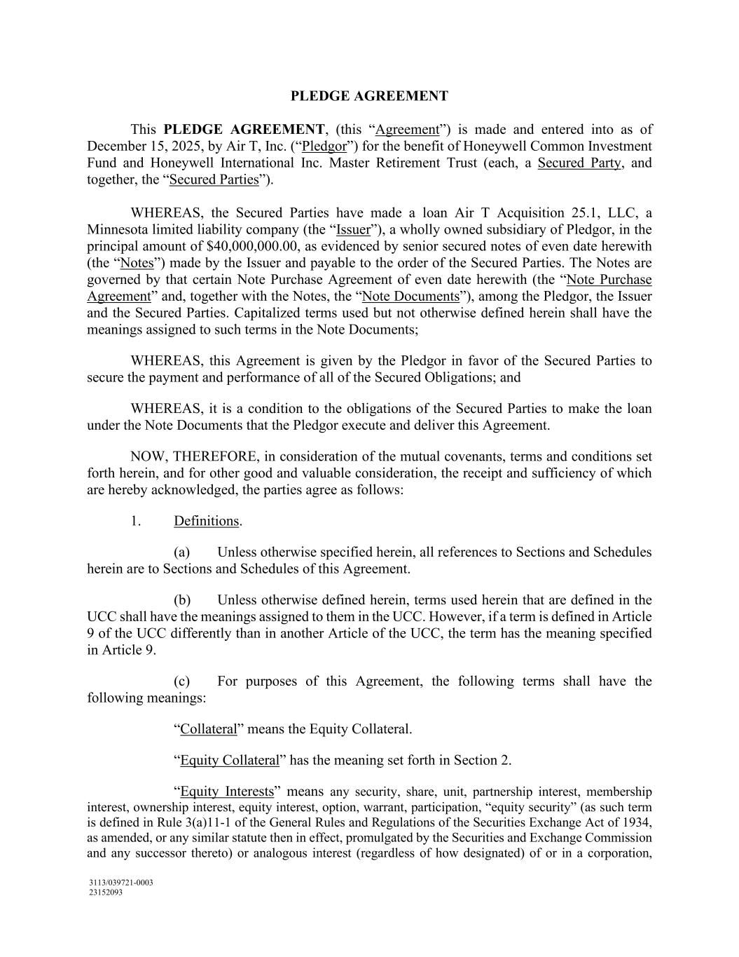 3113/039721-0003 23152093 PLEDGE AGREEMENT This PLEDGE AGREEMENT, (this “Agreement”) is made and entered into as of December 15, 2025, by Air T, Inc. (“Pledgor”) for the benefit of Honeywell Common Investment Fund and Honeywell International Inc. Master Retirement Trust (each, a Secured Party, and together, the “Secured Parties”). WHEREAS, the Secured Parties have made a loan Air T Acquisition 25.1, LLC, a Minnesota limited liability company (the “Issuer”), a wholly owned subsidiary of Pledgor, in the principal amount of $40,000,000.00, as evidenced by senior secured notes of even date herewith (the “Notes”) made by the Issuer and payable to the order of the Secured Parties. The Notes are governed by that certain Note Purchase Agreement of even date herewith (the “Note Purchase Agreement” and, together with the Notes, the “Note Documents”), among the Pledgor, the Issuer and the Secured Parties. Capitalized terms used but not otherwise defined herein shall have the meanings assigned to such terms in the Note Documents; WHEREAS, this Agreement is given by the Pledgor in favor of the Secured Parties to secure the payment and performance of all of the Secured Obligations; and WHEREAS, it is a condition to the obligations of the Secured Parties to make the loan under the Note Documents that the Pledgor execute and deliver this Agreement. NOW, THEREFORE, in consideration of the mutual covenants, terms and conditions set forth herein, and for other good and valuable consideration, the receipt and sufficiency of which are hereby acknowledged, the parties agree as follows: 1. Definitions. (a) Unless otherwise specified herein, all references to Sections and Schedules herein are to Sections and Schedules of this Agreement. (b) Unless otherwise defined herein, terms used herein that are defined in the UCC shall have the meanings assigned to them in the UCC. However, if a term is defined in Article 9 of the UCC differently than in another Article of the UCC, the term has the meaning specified in Article 9. (c) For purposes of this Agreement, the following terms shall have the following meanings: “Collateral” means the Equity Collateral. “Equity Collateral” has the meaning set forth in Section 2. “Equity Interests” means any security, share, unit, partnership interest, membership interest, ownership interest, equity interest, option, warrant, participation, “equity security” (as such term is defined in Rule 3(a)11-1 of the General Rules and Regulations of the Securities Exchange Act of 1934, as amended, or any similar statute then in effect, promulgated by the Securities and Exchange Commission and any successor thereto) or analogous interest (regardless of how designated) of or in a corporation,