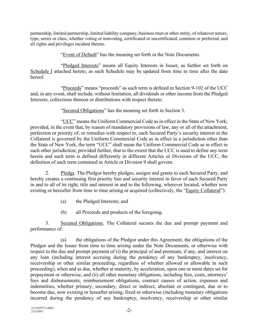3113/039721-0003 23152093 -2- partnership, limited partnership, limited liability company, business trust or other entity, of whatever nature, type, series or class, whether voting or nonvoting, certificated or uncertificated, common or preferred, and all rights and privileges incident thereto. “Event of Default” has the meaning set forth in the Note Documents. “Pledged Interests” means all Equity Interests in Issuer, as further set forth on Schedule I attached hereto, as such Schedule may be updated from time to time after the date hereof. “Proceeds” means “proceeds” as such term is defined in Section 9-102 of the UCC and, in any event, shall include, without limitation, all dividends or other income from the Pledged Interests, collections thereon or distributions with respect thereto. “Secured Obligations” has the meaning set forth in Section 3. “UCC” means the Uniform Commercial Code as in effect in the State of New York; provided, in the event that, by reason of mandatory provisions of law, any or all of the attachment, perfection or priority of, or remedies with respect to, each Secured Party’s security interest in the Collateral is governed by the Uniform Commercial Code as in effect in a jurisdiction other than the State of New York, the term “UCC” shall mean the Uniform Commercial Code as in effect in such other jurisdiction; provided further, that to the extent that the UCC is used to define any term herein and such term is defined differently in different Articles or Divisions of the UCC, the definition of such term contained in Article or Division 9 shall govern. 2. Pledge. The Pledgor hereby pledges, assigns and grants to each Secured Party, and hereby creates a continuing first priority lien and security interest in favor of each Secured Party in and to all of its right, title and interest in and to the following, wherever located, whether now existing or hereafter from time to time arising or acquired (collectively, the “Equity Collateral”): (a) the Pledged Interests; and (b) all Proceeds and products of the foregoing. 3. Secured Obligations. The Collateral secures the due and prompt payment and performance of: (a) the obligations of the Pledgor under this Agreement, the obligations of the Pledgor and the Issuer from time to time arising under the Note Documents, or otherwise with respect to the due and prompt payment of (i) the principal of and premium, if any, and interest on any loan (including interest accruing during the pendency of any bankruptcy, insolvency, receivership or other similar proceeding, regardless of whether allowed or allowable in such proceeding), when and as due, whether at maturity, by acceleration, upon one or more dates set for prepayment or otherwise, and (ii) all other monetary obligations, including fees, costs, attorneys’ fees and disbursements, reimbursement obligations, contract causes of action, expenses and indemnities, whether primary, secondary, direct or indirect, absolute or contingent, due or to become due, now existing or hereafter arising, fixed or otherwise (including monetary obligations incurred during the pendency of any bankruptcy, insolvency, receivership or other similar