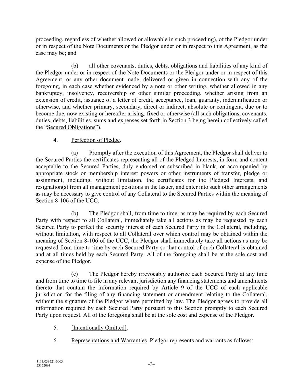 3113/039721-0003 23152093 -3- proceeding, regardless of whether allowed or allowable in such proceeding), of the Pledgor under or in respect of the Note Documents or the Pledgor under or in respect to this Agreement, as the case may be; and (b) all other covenants, duties, debts, obligations and liabilities of any kind of the Pledgor under or in respect of the Note Documents or the Pledgor under or in respect of this Agreement, or any other document made, delivered or given in connection with any of the foregoing, in each case whether evidenced by a note or other writing, whether allowed in any bankruptcy, insolvency, receivership or other similar proceeding, whether arising from an extension of credit, issuance of a letter of credit, acceptance, loan, guaranty, indemnification or otherwise, and whether primary, secondary, direct or indirect, absolute or contingent, due or to become due, now existing or hereafter arising, fixed or otherwise (all such obligations, covenants, duties, debts, liabilities, sums and expenses set forth in Section 3 being herein collectively called the “Secured Obligations”). 4. Perfection of Pledge. (a) Promptly after the execution of this Agreement, the Pledgor shall deliver to the Secured Parties the certificates representing all of the Pledged Interests, in form and content acceptable to the Secured Parties, duly endorsed or subscribed in blank, or accompanied by appropriate stock or membership interest powers or other instruments of transfer, pledge or assignment, including, without limitation, the certificates for the Pledged Interests, and resignation(s) from all management positions in the Issuer, and enter into such other arrangements as may be necessary to give control of any Collateral to the Secured Parties within the meaning of Section 8-106 of the UCC. (b) The Pledgor shall, from time to time, as may be required by each Secured Party with respect to all Collateral, immediately take all actions as may be requested by each Secured Party to perfect the security interest of each Secured Party in the Collateral, including, without limitation, with respect to all Collateral over which control may be obtained within the meaning of Section 8-106 of the UCC, the Pledgor shall immediately take all actions as may be requested from time to time by each Secured Party so that control of such Collateral is obtained and at all times held by each Secured Party. All of the foregoing shall be at the sole cost and expense of the Pledgor. (c) The Pledgor hereby irrevocably authorize each Secured Party at any time and from time to time to file in any relevant jurisdiction any financing statements and amendments thereto that contain the information required by Article 9 of the UCC of each applicable jurisdiction for the filing of any financing statement or amendment relating to the Collateral, without the signature of the Pledgor where permitted by law. The Pledgor agrees to provide all information required by each Secured Party pursuant to this Section promptly to each Secured Party upon request. All of the foregoing shall be at the sole cost and expense of the Pledgor. 5. [Intentionally Omitted]. 6. Representations and Warranties. Pledgor represents and warrants as follows: