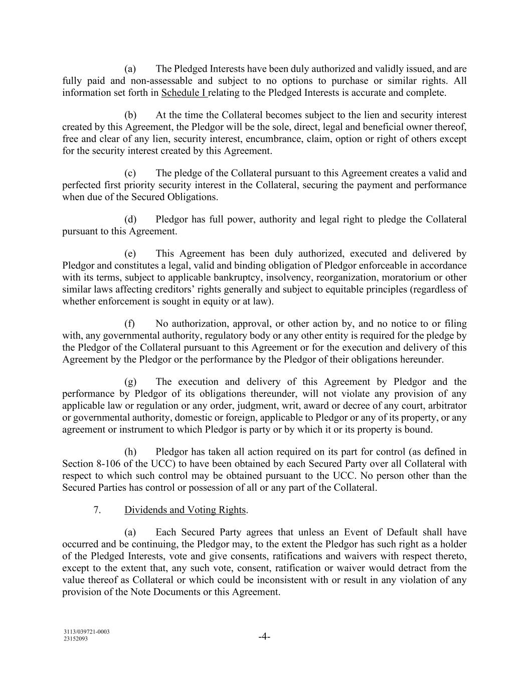 3113/039721-0003 23152093 -4- (a) The Pledged Interests have been duly authorized and validly issued, and are fully paid and non-assessable and subject to no options to purchase or similar rights. All information set forth in Schedule I relating to the Pledged Interests is accurate and complete. (b) At the time the Collateral becomes subject to the lien and security interest created by this Agreement, the Pledgor will be the sole, direct, legal and beneficial owner thereof, free and clear of any lien, security interest, encumbrance, claim, option or right of others except for the security interest created by this Agreement. (c) The pledge of the Collateral pursuant to this Agreement creates a valid and perfected first priority security interest in the Collateral, securing the payment and performance when due of the Secured Obligations. (d) Pledgor has full power, authority and legal right to pledge the Collateral pursuant to this Agreement. (e) This Agreement has been duly authorized, executed and delivered by Pledgor and constitutes a legal, valid and binding obligation of Pledgor enforceable in accordance with its terms, subject to applicable bankruptcy, insolvency, reorganization, moratorium or other similar laws affecting creditors’ rights generally and subject to equitable principles (regardless of whether enforcement is sought in equity or at law). (f) No authorization, approval, or other action by, and no notice to or filing with, any governmental authority, regulatory body or any other entity is required for the pledge by the Pledgor of the Collateral pursuant to this Agreement or for the execution and delivery of this Agreement by the Pledgor or the performance by the Pledgor of their obligations hereunder. (g) The execution and delivery of this Agreement by Pledgor and the performance by Pledgor of its obligations thereunder, will not violate any provision of any applicable law or regulation or any order, judgment, writ, award or decree of any court, arbitrator or governmental authority, domestic or foreign, applicable to Pledgor or any of its property, or any agreement or instrument to which Pledgor is party or by which it or its property is bound. (h) Pledgor has taken all action required on its part for control (as defined in Section 8-106 of the UCC) to have been obtained by each Secured Party over all Collateral with respect to which such control may be obtained pursuant to the UCC. No person other than the Secured Parties has control or possession of all or any part of the Collateral. 7. Dividends and Voting Rights. (a) Each Secured Party agrees that unless an Event of Default shall have occurred and be continuing, the Pledgor may, to the extent the Pledgor has such right as a holder of the Pledged Interests, vote and give consents, ratifications and waivers with respect thereto, except to the extent that, any such vote, consent, ratification or waiver would detract from the value thereof as Collateral or which could be inconsistent with or result in any violation of any provision of the Note Documents or this Agreement.