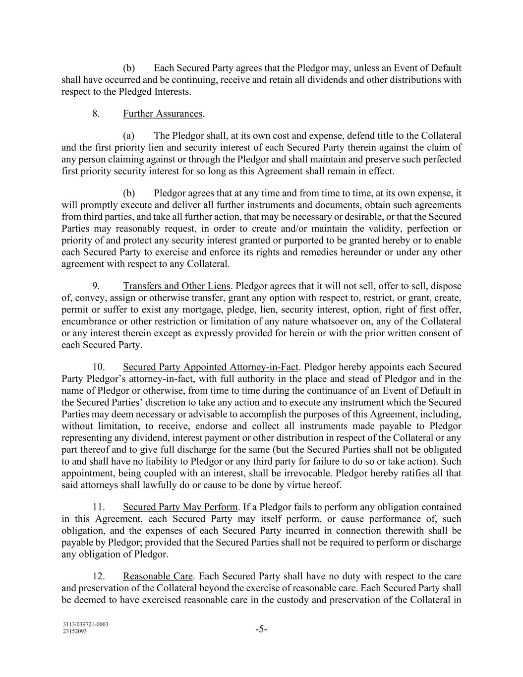 3113/039721-0003 23152093 -5- (b) Each Secured Party agrees that the Pledgor may, unless an Event of Default shall have occurred and be continuing, receive and retain all dividends and other distributions with respect to the Pledged Interests. 8. Further Assurances. (a) The Pledgor shall, at its own cost and expense, defend title to the Collateral and the first priority lien and security interest of each Secured Party therein against the claim of any person claiming against or through the Pledgor and shall maintain and preserve such perfected first priority security interest for so long as this Agreement shall remain in effect. (b) Pledgor agrees that at any time and from time to time, at its own expense, it will promptly execute and deliver all further instruments and documents, obtain such agreements from third parties, and take all further action, that may be necessary or desirable, or that the Secured Parties may reasonably request, in order to create and/or maintain the validity, perfection or priority of and protect any security interest granted or purported to be granted hereby or to enable each Secured Party to exercise and enforce its rights and remedies hereunder or under any other agreement with respect to any Collateral. 9. Transfers and Other Liens. Pledgor agrees that it will not sell, offer to sell, dispose of, convey, assign or otherwise transfer, grant any option with respect to, restrict, or grant, create, permit or suffer to exist any mortgage, pledge, lien, security interest, option, right of first offer, encumbrance or other restriction or limitation of any nature whatsoever on, any of the Collateral or any interest therein except as expressly provided for herein or with the prior written consent of each Secured Party. 10. Secured Party Appointed Attorney-in-Fact. Pledgor hereby appoints each Secured Party Pledgor’s attorney-in-fact, with full authority in the place and stead of Pledgor and in the name of Pledgor or otherwise, from time to time during the continuance of an Event of Default in the Secured Parties’ discretion to take any action and to execute any instrument which the Secured Parties may deem necessary or advisable to accomplish the purposes of this Agreement, including, without limitation, to receive, endorse and collect all instruments made payable to Pledgor representing any dividend, interest payment or other distribution in respect of the Collateral or any part thereof and to give full discharge for the same (but the Secured Parties shall not be obligated to and shall have no liability to Pledgor or any third party for failure to do so or take action). Such appointment, being coupled with an interest, shall be irrevocable. Pledgor hereby ratifies all that said attorneys shall lawfully do or cause to be done by virtue hereof. 11. Secured Party May Perform. If a Pledgor fails to perform any obligation contained in this Agreement, each Secured Party may itself perform, or cause performance of, such obligation, and the expenses of each Secured Party incurred in connection therewith shall be payable by Pledgor; provided that the Secured Parties shall not be required to perform or discharge any obligation of Pledgor. 12. Reasonable Care. Each Secured Party shall have no duty with respect to the care and preservation of the Collateral beyond the exercise of reasonable care. Each Secured Party shall be deemed to have exercised reasonable care in the custody and preservation of the Collateral in