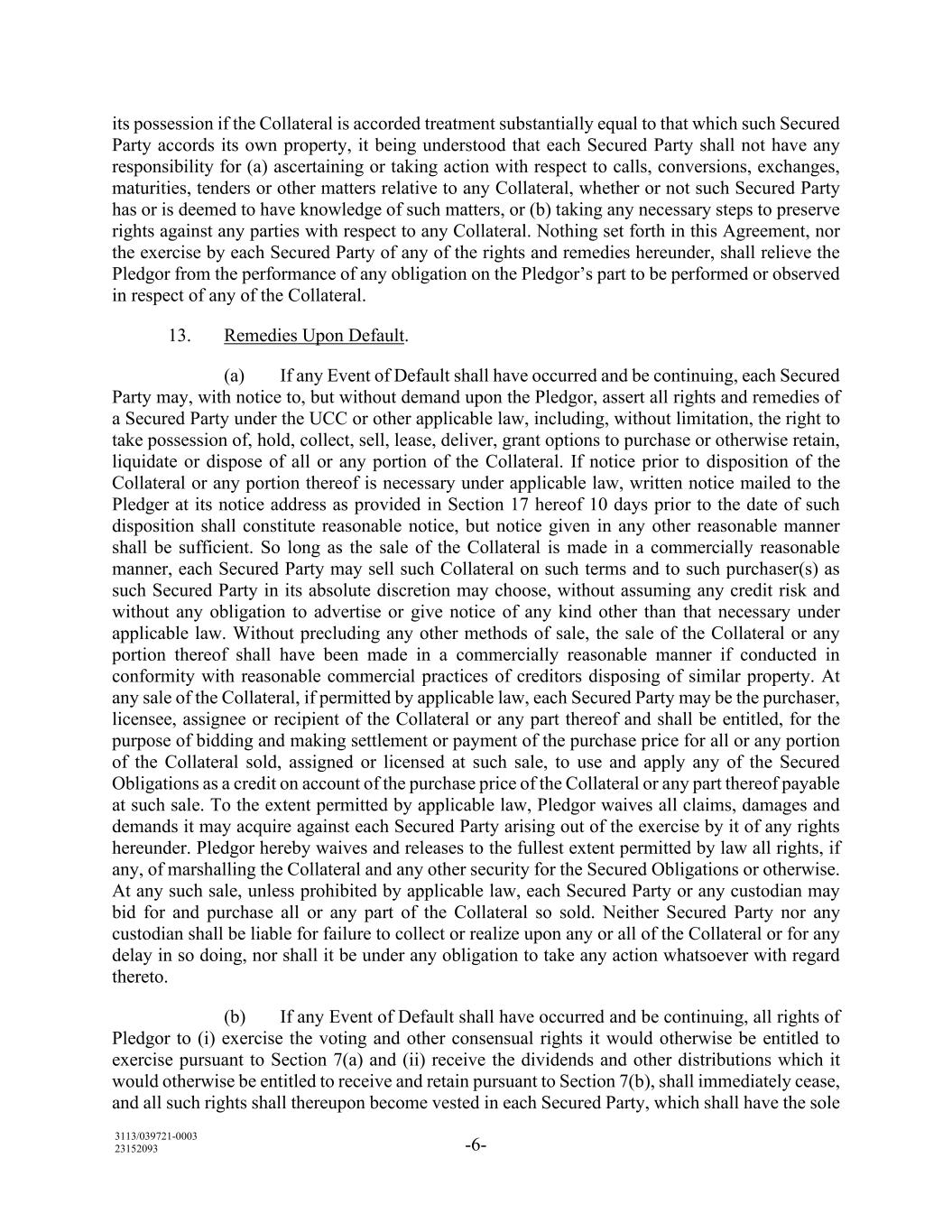 3113/039721-0003 23152093 -6- its possession if the Collateral is accorded treatment substantially equal to that which such Secured Party accords its own property, it being understood that each Secured Party shall not have any responsibility for (a) ascertaining or taking action with respect to calls, conversions, exchanges, maturities, tenders or other matters relative to any Collateral, whether or not such Secured Party has or is deemed to have knowledge of such matters, or (b) taking any necessary steps to preserve rights against any parties with respect to any Collateral. Nothing set forth in this Agreement, nor the exercise by each Secured Party of any of the rights and remedies hereunder, shall relieve the Pledgor from the performance of any obligation on the Pledgor’s part to be performed or observed in respect of any of the Collateral. 13. Remedies Upon Default. (a) If any Event of Default shall have occurred and be continuing, each Secured Party may, with notice to, but without demand upon the Pledgor, assert all rights and remedies of a Secured Party under the UCC or other applicable law, including, without limitation, the right to take possession of, hold, collect, sell, lease, deliver, grant options to purchase or otherwise retain, liquidate or dispose of all or any portion of the Collateral. If notice prior to disposition of the Collateral or any portion thereof is necessary under applicable law, written notice mailed to the Pledger at its notice address as provided in Section 17 hereof 10 days prior to the date of such disposition shall constitute reasonable notice, but notice given in any other reasonable manner shall be sufficient. So long as the sale of the Collateral is made in a commercially reasonable manner, each Secured Party may sell such Collateral on such terms and to such purchaser(s) as such Secured Party in its absolute discretion may choose, without assuming any credit risk and without any obligation to advertise or give notice of any kind other than that necessary under applicable law. Without precluding any other methods of sale, the sale of the Collateral or any portion thereof shall have been made in a commercially reasonable manner if conducted in conformity with reasonable commercial practices of creditors disposing of similar property. At any sale of the Collateral, if permitted by applicable law, each Secured Party may be the purchaser, licensee, assignee or recipient of the Collateral or any part thereof and shall be entitled, for the purpose of bidding and making settlement or payment of the purchase price for all or any portion of the Collateral sold, assigned or licensed at such sale, to use and apply any of the Secured Obligations as a credit on account of the purchase price of the Collateral or any part thereof payable at such sale. To the extent permitted by applicable law, Pledgor waives all claims, damages and demands it may acquire against each Secured Party arising out of the exercise by it of any rights hereunder. Pledgor hereby waives and releases to the fullest extent permitted by law all rights, if any, of marshalling the Collateral and any other security for the Secured Obligations or otherwise. At any such sale, unless prohibited by applicable law, each Secured Party or any custodian may bid for and purchase all or any part of the Collateral so sold. Neither Secured Party nor any custodian shall be liable for failure to collect or realize upon any or all of the Collateral or for any delay in so doing, nor shall it be under any obligation to take any action whatsoever with regard thereto. (b) If any Event of Default shall have occurred and be continuing, all rights of Pledgor to (i) exercise the voting and other consensual rights it would otherwise be entitled to exercise pursuant to Section 7(a) and (ii) receive the dividends and other distributions which it would otherwise be entitled to receive and retain pursuant to Section 7(b), shall immediately cease, and all such rights shall thereupon become vested in each Secured Party, which shall have the sole