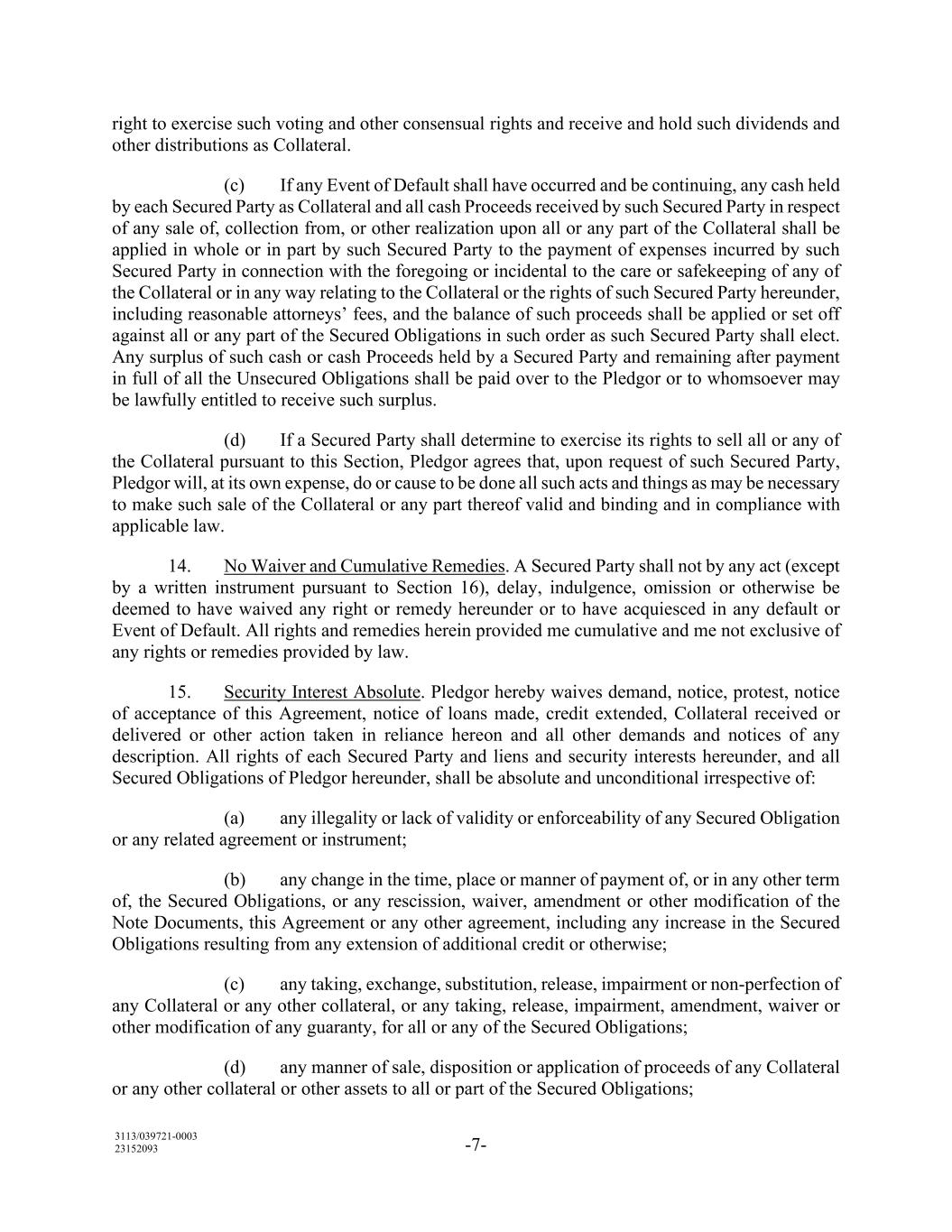 3113/039721-0003 23152093 -7- right to exercise such voting and other consensual rights and receive and hold such dividends and other distributions as Collateral. (c) If any Event of Default shall have occurred and be continuing, any cash held by each Secured Party as Collateral and all cash Proceeds received by such Secured Party in respect of any sale of, collection from, or other realization upon all or any part of the Collateral shall be applied in whole or in part by such Secured Party to the payment of expenses incurred by such Secured Party in connection with the foregoing or incidental to the care or safekeeping of any of the Collateral or in any way relating to the Collateral or the rights of such Secured Party hereunder, including reasonable attorneys’ fees, and the balance of such proceeds shall be applied or set off against all or any part of the Secured Obligations in such order as such Secured Party shall elect. Any surplus of such cash or cash Proceeds held by a Secured Party and remaining after payment in full of all the Unsecured Obligations shall be paid over to the Pledgor or to whomsoever may be lawfully entitled to receive such surplus. (d) If a Secured Party shall determine to exercise its rights to sell all or any of the Collateral pursuant to this Section, Pledgor agrees that, upon request of such Secured Party, Pledgor will, at its own expense, do or cause to be done all such acts and things as may be necessary to make such sale of the Collateral or any part thereof valid and binding and in compliance with applicable law. 14. No Waiver and Cumulative Remedies. A Secured Party shall not by any act (except by a written instrument pursuant to Section 16), delay, indulgence, omission or otherwise be deemed to have waived any right or remedy hereunder or to have acquiesced in any default or Event of Default. All rights and remedies herein provided me cumulative and me not exclusive of any rights or remedies provided by law. 15. Security Interest Absolute. Pledgor hereby waives demand, notice, protest, notice of acceptance of this Agreement, notice of loans made, credit extended, Collateral received or delivered or other action taken in reliance hereon and all other demands and notices of any description. All rights of each Secured Party and liens and security interests hereunder, and all Secured Obligations of Pledgor hereunder, shall be absolute and unconditional irrespective of: (a) any illegality or lack of validity or enforceability of any Secured Obligation or any related agreement or instrument; (b) any change in the time, place or manner of payment of, or in any other term of, the Secured Obligations, or any rescission, waiver, amendment or other modification of the Note Documents, this Agreement or any other agreement, including any increase in the Secured Obligations resulting from any extension of additional credit or otherwise; (c) any taking, exchange, substitution, release, impairment or non-perfection of any Collateral or any other collateral, or any taking, release, impairment, amendment, waiver or other modification of any guaranty, for all or any of the Secured Obligations; (d) any manner of sale, disposition or application of proceeds of any Collateral or any other collateral or other assets to all or part of the Secured Obligations;