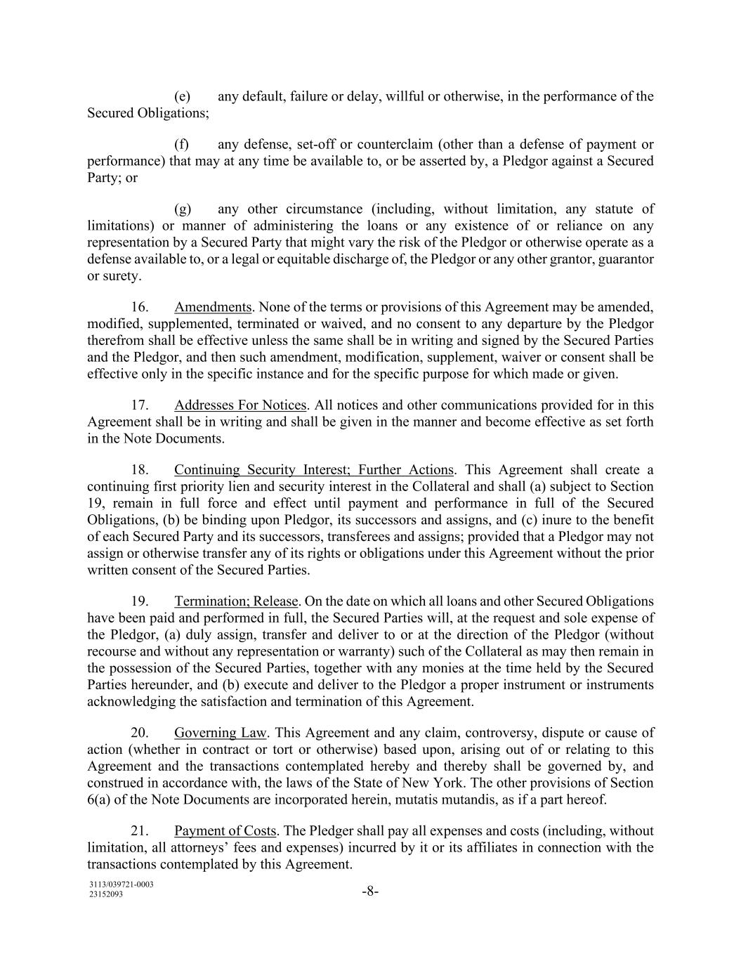 3113/039721-0003 23152093 -8- (e) any default, failure or delay, willful or otherwise, in the performance of the Secured Obligations; (f) any defense, set-off or counterclaim (other than a defense of payment or performance) that may at any time be available to, or be asserted by, a Pledgor against a Secured Party; or (g) any other circumstance (including, without limitation, any statute of limitations) or manner of administering the loans or any existence of or reliance on any representation by a Secured Party that might vary the risk of the Pledgor or otherwise operate as a defense available to, or a legal or equitable discharge of, the Pledgor or any other grantor, guarantor or surety. 16. Amendments. None of the terms or provisions of this Agreement may be amended, modified, supplemented, terminated or waived, and no consent to any departure by the Pledgor therefrom shall be effective unless the same shall be in writing and signed by the Secured Parties and the Pledgor, and then such amendment, modification, supplement, waiver or consent shall be effective only in the specific instance and for the specific purpose for which made or given. 17. Addresses For Notices. All notices and other communications provided for in this Agreement shall be in writing and shall be given in the manner and become effective as set forth in the Note Documents. 18. Continuing Security Interest; Further Actions. This Agreement shall create a continuing first priority lien and security interest in the Collateral and shall (a) subject to Section 19, remain in full force and effect until payment and performance in full of the Secured Obligations, (b) be binding upon Pledgor, its successors and assigns, and (c) inure to the benefit of each Secured Party and its successors, transferees and assigns; provided that a Pledgor may not assign or otherwise transfer any of its rights or obligations under this Agreement without the prior written consent of the Secured Parties. 19. Termination; Release. On the date on which all loans and other Secured Obligations have been paid and performed in full, the Secured Parties will, at the request and sole expense of the Pledgor, (a) duly assign, transfer and deliver to or at the direction of the Pledgor (without recourse and without any representation or warranty) such of the Collateral as may then remain in the possession of the Secured Parties, together with any monies at the time held by the Secured Parties hereunder, and (b) execute and deliver to the Pledgor a proper instrument or instruments acknowledging the satisfaction and termination of this Agreement. 20. Governing Law. This Agreement and any claim, controversy, dispute or cause of action (whether in contract or tort or otherwise) based upon, arising out of or relating to this Agreement and the transactions contemplated hereby and thereby shall be governed by, and construed in accordance with, the laws of the State of New York. The other provisions of Section 6(a) of the Note Documents are incorporated herein, mutatis mutandis, as if a part hereof. 21. Payment of Costs. The Pledger shall pay all expenses and costs (including, without limitation, all attorneys’ fees and expenses) incurred by it or its affiliates in connection with the transactions contemplated by this Agreement.