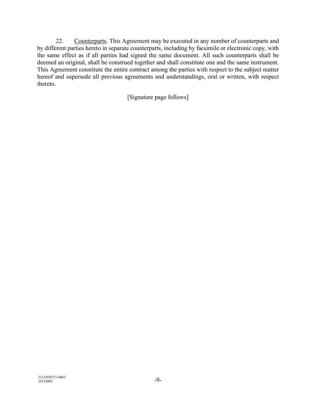 3113/039721-0003 23152093 -9- 22. Counterparts. This Agreement may be executed in any number of counterparts and by different parties hereto in separate counterparts, including by facsimile or electronic copy, with the same effect as if all parties had signed the same document. All such counterparts shall be deemed an original, shall be construed together and shall constitute one and the same instrument. This Agreement constitute the entire contract among the parties with respect to the subject matter hereof and supersede all previous agreements and understandings, oral or written, with respect thereto. [Signature page follows]