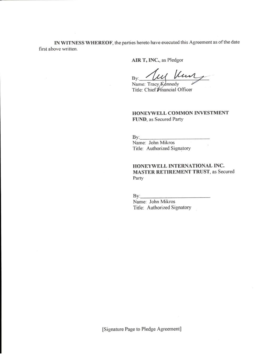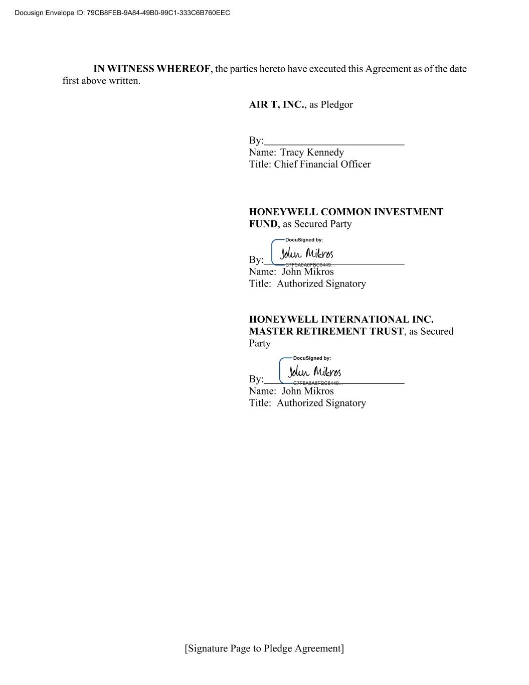 [Signature Page to Pledge Agreement] IN WITNESS WHEREOF, the parties hereto have executed this Agreement as of the date first above written. AIR T, INC., as Pledgor By: Name: Tracy Kennedy Title: Chief Financial Officer HONEYWELL COMMON INVESTMENT FUND, as Secured Party By: Name: John Mikros Title: Authorized Signatory HONEYWELL INTERNATIONAL INC. MASTER RETIREMENT TRUST, as Secured Party By: Name: John Mikros Title: Authorized Signatory Docusign Envelope ID: 79CB8FEB-9A84-49B0-99C1-333C6B760EEC