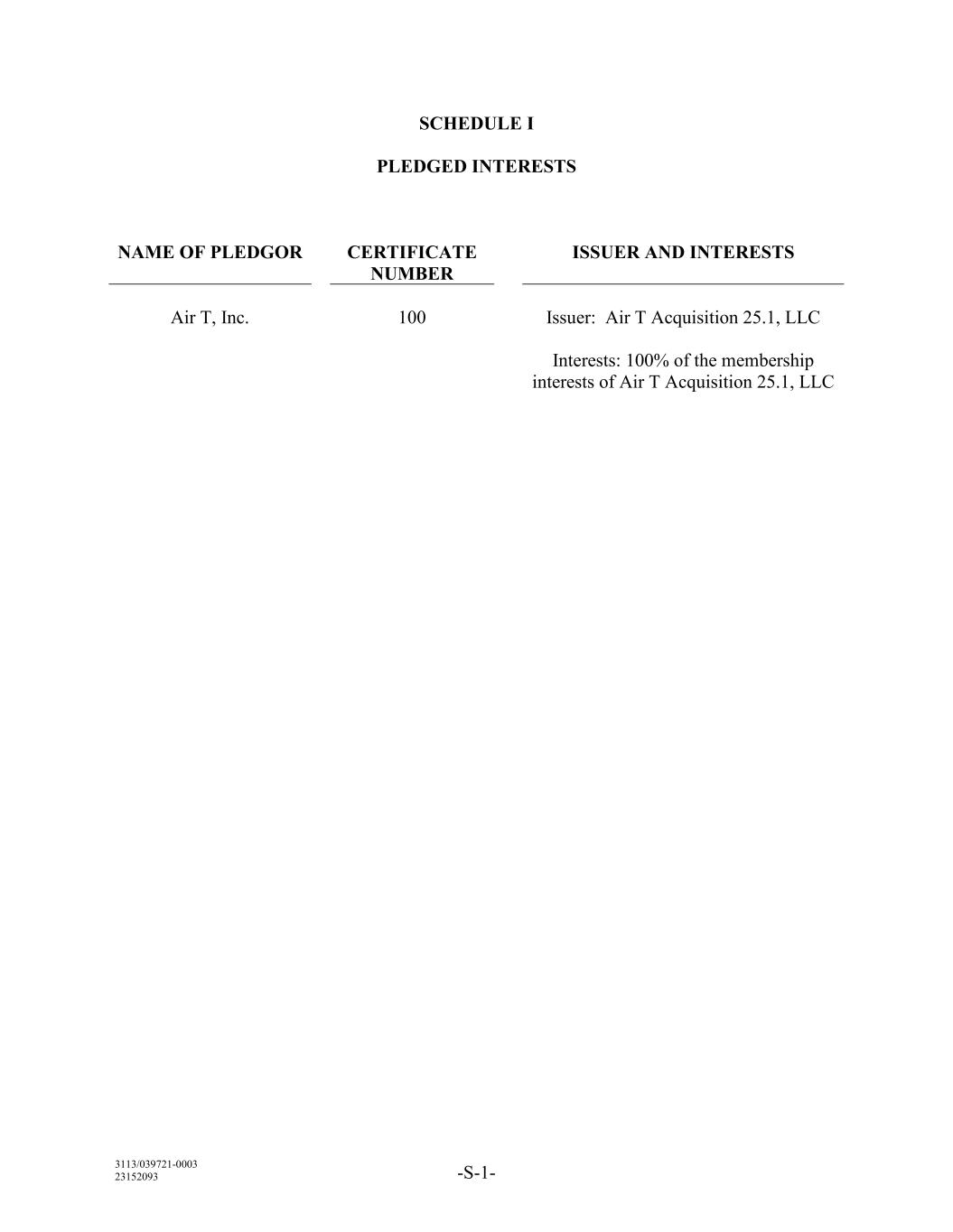 3113/039721-0003 23152093 -S-1- SCHEDULE I PLEDGED INTERESTS NAME OF PLEDGOR CERTIFICATE NUMBER ISSUER AND INTERESTS Air T, Inc. 100 Issuer: Air T Acquisition 25.1, LLC Interests: 100% of the membership interests of Air T Acquisition 25.1, LLC