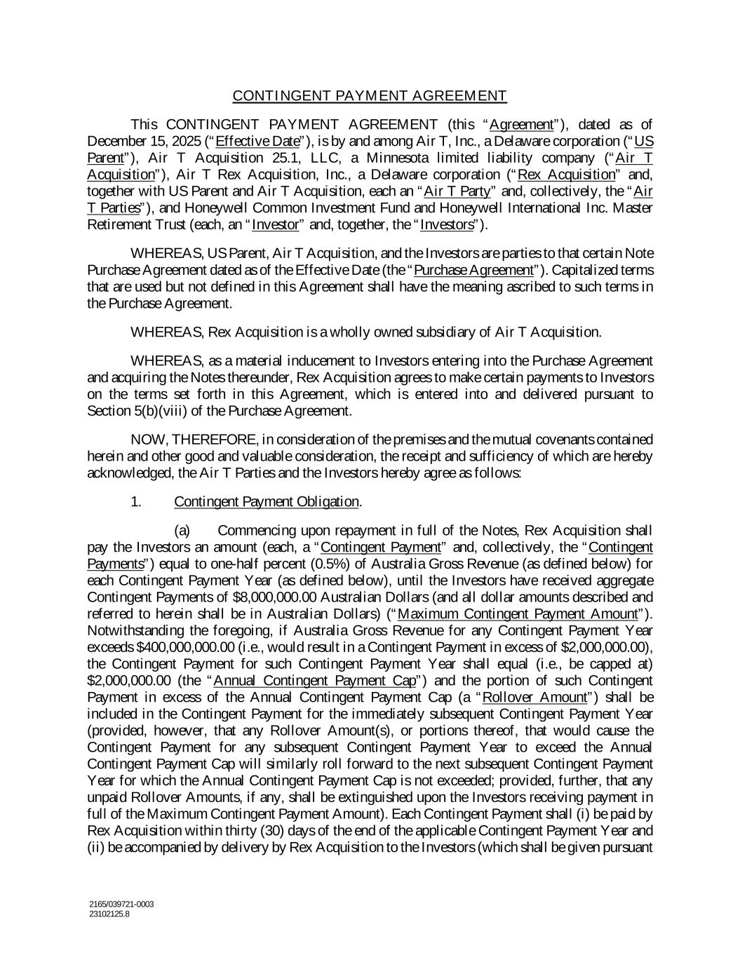 2165/039721-0003 23102125.8 CONTINGENT PAYMENT AGREEMENT This CONTINGENT PAYMENT AGREEMENT (this “Agreement”), dated as of December 15, 2025 (“Effective Date”), is by and among Air T, Inc., a Delaware corporation (“US Parent”), Air T Acquisition 25.1, LLC, a Minnesota limited liability company (“Air T Acquisition”), Air T Rex Acquisition, Inc., a Delaware corporation (“Rex Acquisition” and, together with US Parent and Air T Acquisition, each an “Air T Party” and, collectively, the “Air T Parties”), and Honeywell Common Investment Fund and Honeywell International Inc. Master Retirement Trust (each, an “Investor” and, together, the “Investors”). WHEREAS, US Parent, Air T Acquisition, and the Investors are parties to that certain Note Purchase Agreement dated as of the Effective Date (the “Purchase Agreement”). Capitalized terms that are used but not defined in this Agreement shall have the meaning ascribed to such terms in the Purchase Agreement. WHEREAS, Rex Acquisition is a wholly owned subsidiary of Air T Acquisition. WHEREAS, as a material inducement to Investors entering into the Purchase Agreement and acquiring the Notes thereunder, Rex Acquisition agrees to make certain payments to Investors on the terms set forth in this Agreement, which is entered into and delivered pursuant to Section 5(b)(viii) of the Purchase Agreement. NOW, THEREFORE, in consideration of the premises and the mutual covenants contained herein and other good and valuable consideration, the receipt and sufficiency of which are hereby acknowledged, the Air T Parties and the Investors hereby agree as follows: 1. Contingent Payment Obligation. (a) Commencing upon repayment in full of the Notes, Rex Acquisition shall pay the Investors an amount (each, a “Contingent Payment” and, collectively, the “Contingent Payments”) equal to one-half percent (0.5%) of Australia Gross Revenue (as defined below) for each Contingent Payment Year (as defined below), until the Investors have received aggregate Contingent Payments of $8,000,000.00 Australian Dollars (and all dollar amounts described and referred to herein shall be in Australian Dollars) (“Maximum Contingent Payment Amount”). Notwithstanding the foregoing, if Australia Gross Revenue for any Contingent Payment Year exceeds $400,000,000.00 (i.e., would result in a Contingent Payment in excess of $2,000,000.00), the Contingent Payment for such Contingent Payment Year shall equal (i.e., be capped at) $2,000,000.00 (the “Annual Contingent Payment Cap”) and the portion of such Contingent Payment in excess of the Annual Contingent Payment Cap (a “Rollover Amount”) shall be included in the Contingent Payment for the immediately subsequent Contingent Payment Year (provided, however, that any Rollover Amount(s), or portions thereof, that would cause the Contingent Payment for any subsequent Contingent Payment Year to exceed the Annual Contingent Payment Cap will similarly roll forward to the next subsequent Contingent Payment Year for which the Annual Contingent Payment Cap is not exceeded; provided, further, that any unpaid Rollover Amounts, if any, shall be extinguished upon the Investors receiving payment in full of the Maximum Contingent Payment Amount). Each Contingent Payment shall (i) be paid by Rex Acquisition within thirty (30) days of the end of the applicable Contingent Payment Year and (ii) be accompanied by delivery by Rex Acquisition to the Investors (which shall be given pursuant