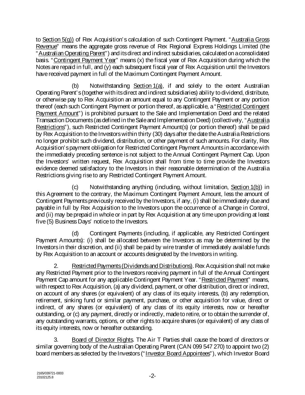 2165/039721-0003 23102125.8 -2- to Section 5(g)) of Rex Acquisition’s calculation of such Contingent Payment. “Australia Gross Revenue” means the aggregate gross revenue of Rex Regional Express Holdings Limited (the “Australian Operating Parent”) and its direct and indirect subsidiaries, calculated on a consolidated basis. “Contingent Payment Year” means (x) the fiscal year of Rex Acquisition during which the Notes are repaid in full, and (y) each subsequent fiscal year of Rex Acquisition until the Investors have received payment in full of the Maximum Contingent Payment Amount. (b) Notwithstanding Section 1(a), if and solely to the extent Australian Operating Parent’s (together with its direct and indirect subsidiaries) ability to dividend, distribute, or otherwise pay to Rex Acquisition an amount equal to any Contingent Payment or any portion thereof (each such Contingent Payment or portion thereof, as applicable, a “Restricted Contingent Payment Amount”) is prohibited pursuant to the Sale and Implementation Deed and the related Transaction Documents (as defined in the Sale and Implementation Deed) (collectively, “Australia Restrictions”), such Restricted Contingent Payment Amount(s) (or portion thereof) shall be paid by Rex Acquisition to the Investors within thirty (30) days after the date the Australia Restrictions no longer prohibit such dividend, distribution, or other payment of such amounts. For clarity, Rex Acquisition’s payment obligation for Restricted Contingent Payment Amounts in accordance with the immediately preceding sentence is not subject to the Annual Contingent Payment Cap. Upon the Investors’ written request, Rex Acquisition shall from time to time provide the Investors evidence deemed satisfactory to the Investors in their reasonable determination of the Australia Restrictions giving rise to any Restricted Contingent Payment Amount. (c) Notwithstanding anything (including, without limitation, Section 1(b)) in this Agreement to the contrary, the Maximum Contingent Payment Amount, less the amount of Contingent Payments previously received by the Investors, if any, (i) shall be immediately due and payable in full by Rex Acquisition to the Investors upon the occurrence of a Change in Control, and (ii) may be prepaid in whole or in part by Rex Acquisition at any time upon providing at least five (5) Business Days’ notice to the Investors. (d) Contingent Payments (including, if applicable, any Restricted Contingent Payment Amounts): (i) shall be allocated between the Investors as may be determined by the Investors in their discretion, and (ii) shall be paid by wire transfer of immediately available funds by Rex Acquisition to an account or accounts designated by the Investors in writing. 2. Restricted Payments (Dividends and Distributions). Rex Acquisition shall not make any Restricted Payment prior to the Investors receiving payment in full of the Annual Contingent Payment Cap amount for any applicable Contingent Payment Year. “Restricted Payment” means, with respect to Rex Acquisition, (a) any dividend, payment, or other distribution, direct or indirect, on account of any shares (or equivalent) of any class of its equity interests, (b) any redemption, retirement, sinking fund or similar payment, purchase, or other acquisition for value, direct or indirect, of any shares (or equivalent) of any class of its equity interests, now or hereafter outstanding, or (c) any payment, directly or indirectly, made to retire, or to obtain the surrender of, any outstanding warrants, options, or other rights to acquire shares (or equivalent) of any class of its equity interests, now or hereafter outstanding. 3. Board of Director Rights. The Air T Parties shall cause the board of directors or similar governing body of the Australian Operating Parent (CAN 099 547 270) to appoint two (2) board members as selected by the Investors (“Investor Board Appointees”), which Investor Board
