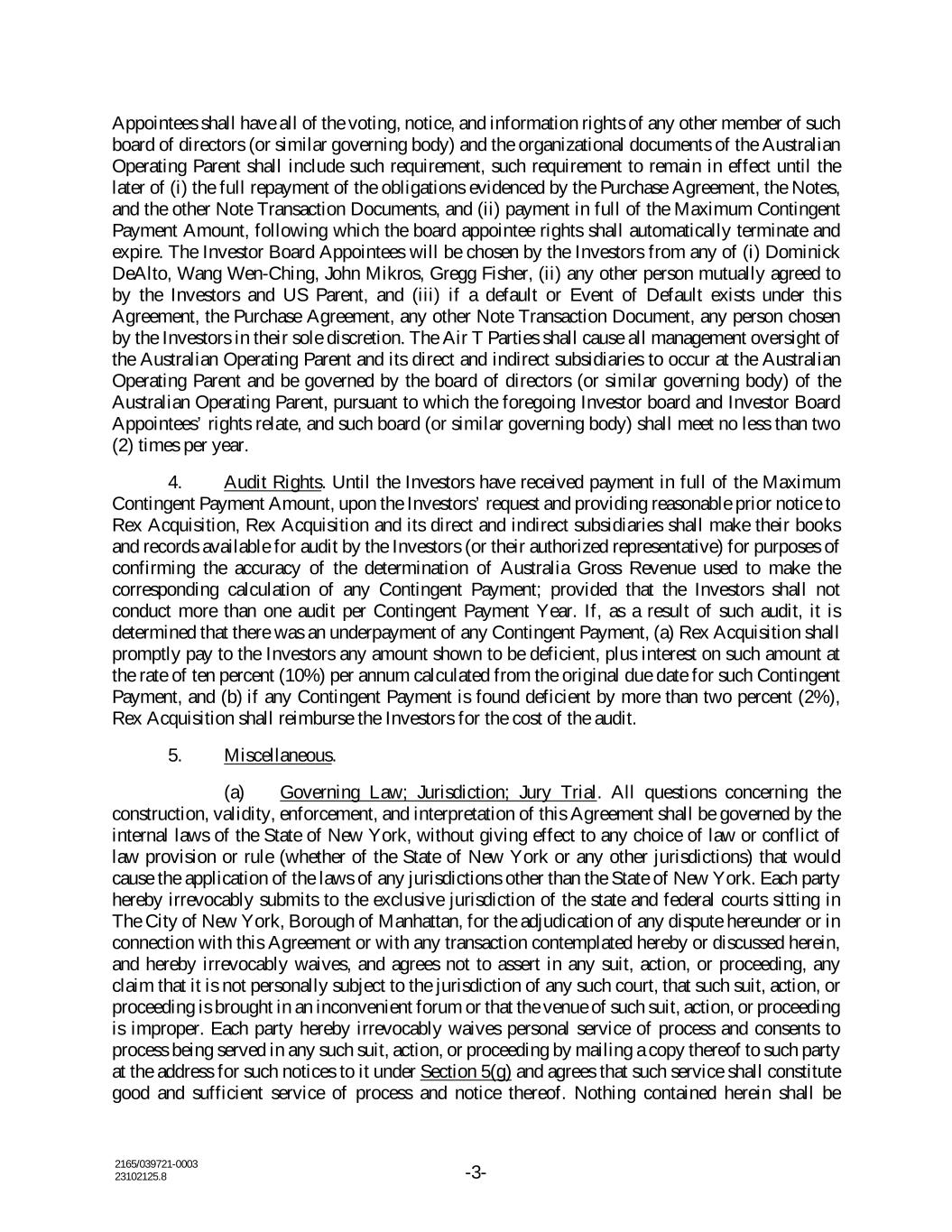 2165/039721-0003 23102125.8 -3- Appointees shall have all of the voting, notice, and information rights of any other member of such board of directors (or similar governing body) and the organizational documents of the Australian Operating Parent shall include such requirement, such requirement to remain in effect until the later of (i) the full repayment of the obligations evidenced by the Purchase Agreement, the Notes, and the other Note Transaction Documents, and (ii) payment in full of the Maximum Contingent Payment Amount, following which the board appointee rights shall automatically terminate and expire. The Investor Board Appointees will be chosen by the Investors from any of (i) Dominick DeAlto, Wang Wen-Ching, John Mikros, Gregg Fisher, (ii) any other person mutually agreed to by the Investors and US Parent, and (iii) if a default or Event of Default exists under this Agreement, the Purchase Agreement, any other Note Transaction Document, any person chosen by the Investors in their sole discretion. The Air T Parties shall cause all management oversight of the Australian Operating Parent and its direct and indirect subsidiaries to occur at the Australian Operating Parent and be governed by the board of directors (or similar governing body) of the Australian Operating Parent, pursuant to which the foregoing Investor board and Investor Board Appointees’ rights relate, and such board (or similar governing body) shall meet no less than two (2) times per year. 4. Audit Rights. Until the Investors have received payment in full of the Maximum Contingent Payment Amount, upon the Investors’ request and providing reasonable prior notice to Rex Acquisition, Rex Acquisition and its direct and indirect subsidiaries shall make their books and records available for audit by the Investors (or their authorized representative) for purposes of confirming the accuracy of the determination of Australia Gross Revenue used to make the corresponding calculation of any Contingent Payment; provided that the Investors shall not conduct more than one audit per Contingent Payment Year. If, as a result of such audit, it is determined that there was an underpayment of any Contingent Payment, (a) Rex Acquisition shall promptly pay to the Investors any amount shown to be deficient, plus interest on such amount at the rate of ten percent (10%) per annum calculated from the original due date for such Contingent Payment, and (b) if any Contingent Payment is found deficient by more than two percent (2%), Rex Acquisition shall reimburse the Investors for the cost of the audit. 5. Miscellaneous. (a) Governing Law; Jurisdiction; Jury Trial. All questions concerning the construction, validity, enforcement, and interpretation of this Agreement shall be governed by the internal laws of the State of New York, without giving effect to any choice of law or conflict of law provision or rule (whether of the State of New York or any other jurisdictions) that would cause the application of the laws of any jurisdictions other than the State of New York. Each party hereby irrevocably submits to the exclusive jurisdiction of the state and federal courts sitting in The City of New York, Borough of Manhattan, for the adjudication of any dispute hereunder or in connection with this Agreement or with any transaction contemplated hereby or discussed herein, and hereby irrevocably waives, and agrees not to assert in any suit, action, or proceeding, any claim that it is not personally subject to the jurisdiction of any such court, that such suit, action, or proceeding is brought in an inconvenient forum or that the venue of such suit, action, or proceeding is improper. Each party hereby irrevocably waives personal service of process and consents to process being served in any such suit, action, or proceeding by mailing a copy thereof to such party at the address for such notices to it under Section 5(g) and agrees that such service shall constitute good and sufficient service of process and notice thereof. Nothing contained herein shall be