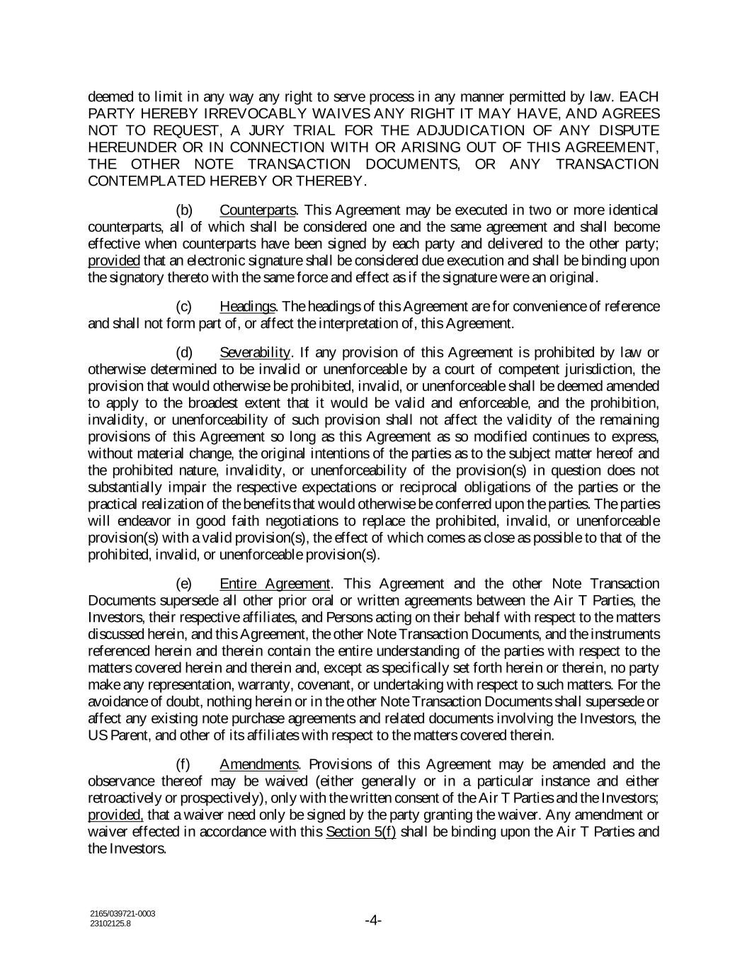 2165/039721-0003 23102125.8 -4- deemed to limit in any way any right to serve process in any manner permitted by law. EACH PARTY HEREBY IRREVOCABLY WAIVES ANY RIGHT IT MAY HAVE, AND AGREES NOT TO REQUEST, A JURY TRIAL FOR THE ADJUDICATION OF ANY DISPUTE HEREUNDER OR IN CONNECTION WITH OR ARISING OUT OF THIS AGREEMENT, THE OTHER NOTE TRANSACTION DOCUMENTS, OR ANY TRANSACTION CONTEMPLATED HEREBY OR THEREBY. (b) Counterparts. This Agreement may be executed in two or more identical counterparts, all of which shall be considered one and the same agreement and shall become effective when counterparts have been signed by each party and delivered to the other party; provided that an electronic signature shall be considered due execution and shall be binding upon the signatory thereto with the same force and effect as if the signature were an original. (c) Headings. The headings of this Agreement are for convenience of reference and shall not form part of, or affect the interpretation of, this Agreement. (d) Severability. If any provision of this Agreement is prohibited by law or otherwise determined to be invalid or unenforceable by a court of competent jurisdiction, the provision that would otherwise be prohibited, invalid, or unenforceable shall be deemed amended to apply to the broadest extent that it would be valid and enforceable, and the prohibition, invalidity, or unenforceability of such provision shall not affect the validity of the remaining provisions of this Agreement so long as this Agreement as so modified continues to express, without material change, the original intentions of the parties as to the subject matter hereof and the prohibited nature, invalidity, or unenforceability of the provision(s) in question does not substantially impair the respective expectations or reciprocal obligations of the parties or the practical realization of the benefits that would otherwise be conferred upon the parties. The parties will endeavor in good faith negotiations to replace the prohibited, invalid, or unenforceable provision(s) with a valid provision(s), the effect of which comes as close as possible to that of the prohibited, invalid, or unenforceable provision(s). (e) Entire Agreement. This Agreement and the other Note Transaction Documents supersede all other prior oral or written agreements between the Air T Parties, the Investors, their respective affiliates, and Persons acting on their behalf with respect to the matters discussed herein, and this Agreement, the other Note Transaction Documents, and the instruments referenced herein and therein contain the entire understanding of the parties with respect to the matters covered herein and therein and, except as specifically set forth herein or therein, no party make any representation, warranty, covenant, or undertaking with respect to such matters. For the avoidance of doubt, nothing herein or in the other Note Transaction Documents shall supersede or affect any existing note purchase agreements and related documents involving the Investors, the US Parent, and other of its affiliates with respect to the matters covered therein. (f) Amendments. Provisions of this Agreement may be amended and the observance thereof may be waived (either generally or in a particular instance and either retroactively or prospectively), only with the written consent of the Air T Parties and the Investors; provided, that a waiver need only be signed by the party granting the waiver. Any amendment or waiver effected in accordance with this Section 5(f) shall be binding upon the Air T Parties and the Investors.