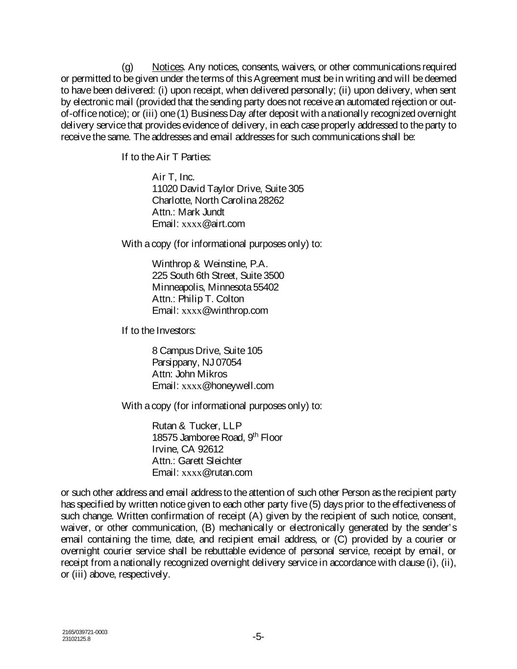 2165/039721-0003 23102125.8 -5- (g) Notices. Any notices, consents, waivers, or other communications required or permitted to be given under the terms of this Agreement must be in writing and will be deemed to have been delivered: (i) upon receipt, when delivered personally; (ii) upon delivery, when sent by electronic mail (provided that the sending party does not receive an automated rejection or out- of-office notice); or (iii) one (1) Business Day after deposit with a nationally recognized overnight delivery service that provides evidence of delivery, in each case properly addressed to the party to receive the same. The addresses and email addresses for such communications shall be: If to the Air T Parties: Air T, Inc. 11020 David Taylor Drive, Suite 305 Charlotte, North Carolina 28262 Attn.: Mark Jundt Email: xxxx@airt.com With a copy (for informational purposes only) to: Winthrop & Weinstine, P.A. 225 South 6th Street, Suite 3500 Minneapolis, Minnesota 55402 Attn.: Philip T. Colton Email: xxxx@winthrop.com If to the Investors: 8 Campus Drive, Suite 105 Parsippany, NJ 07054 Attn: John Mikros Email: xxxx@honeywell.com With a copy (for informational purposes only) to: Rutan & Tucker, LLP 18575 Jamboree Road, 9th Floor Irvine, CA 92612 Attn.: Garett Sleichter Email: xxxx@rutan.com or such other address and email address to the attention of such other Person as the recipient party has specified by written notice given to each other party five (5) days prior to the effectiveness of such change. Written confirmation of receipt (A) given by the recipient of such notice, consent, waiver, or other communication, (B) mechanically or electronically generated by the sender’s email containing the time, date, and recipient email address, or (C) provided by a courier or overnight courier service shall be rebuttable evidence of personal service, receipt by email, or receipt from a nationally recognized overnight delivery service in accordance with clause (i), (ii), or (iii) above, respectively.