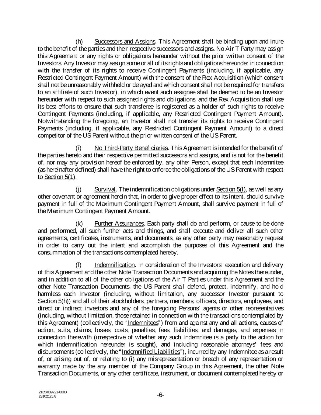 2165/039721-0003 23102125.8 -6- (h) Successors and Assigns. This Agreement shall be binding upon and inure to the benefit of the parties and their respective successors and assigns. No Air T Party may assign this Agreement or any rights or obligations hereunder without the prior written consent of the Investors. Any Investor may assign some or all of its rights and obligations hereunder in connection with the transfer of its rights to receive Contingent Payments (including, if applicable, any Restricted Contingent Payment Amount) with the consent of the Rex Acquisition (which consent shall not be unreasonably withheld or delayed and which consent shall not be required for transfers to an affiliate of such Investor), in which event such assignee shall be deemed to be an Investor hereunder with respect to such assigned rights and obligations, and the Rex Acquisition shall use its best efforts to ensure that such transferee is registered as a holder of such rights to receive Contingent Payments (including, if applicable, any Restricted Contingent Payment Amount). Notwithstanding the foregoing, an Investor shall not transfer its rights to receive Contingent Payments (including, if applicable, any Restricted Contingent Payment Amount) to a direct competitor of the US Parent without the prior written consent of the US Parent. (i) No Third-Party Beneficiaries. This Agreement is intended for the benefit of the parties hereto and their respective permitted successors and assigns, and is not for the benefit of, nor may any provision hereof be enforced by, any other Person, except that each Indemnitee (as hereinafter defined) shall have the right to enforce the obligations of the US Parent with respect to Section 5(1). (j) Survival. The indemnification obligations under Section 5(l), as well as any other covenant or agreement herein that, in order to give proper effect to its intent, should survive payment in full of the Maximum Contingent Payment Amount, shall survive payment in full of the Maximum Contingent Payment Amount. (k) Further Assurances. Each party shall do and perform, or cause to be done and performed, all such further acts and things, and shall execute and deliver all such other agreements, certificates, instruments, and documents, as any other party may reasonably request in order to carry out the intent and accomplish the purposes of this Agreement and the consummation of the transactions contemplated hereby. (l) Indemnification. In consideration of the Investors’ execution and delivery of this Agreement and the other Note Transaction Documents and acquiring the Notes thereunder, and in addition to all of the other obligations of the Air T Parties under this Agreement and the other Note Transaction Documents, the US Parent shall defend, protect, indemnify, and hold harmless each Investor (including, without limitation, any successor Investor pursuant to Section 5(h)) and all of their stockholders, partners, members, officers, directors, employees, and direct or indirect investors and any of the foregoing Persons’ agents or other representatives (including, without limitation, those retained in connection with the transactions contemplated by this Agreement) (collectively, the “Indemnitees”) from and against any and all actions, causes of action, suits, claims, losses, costs, penalties, fees, liabilities, and damages, and expenses in connection therewith (irrespective of whether any such Indemnitee is a party to the action for which indemnification hereunder is sought), and including reasonable attorneys’ fees and disbursements (collectively, the “Indemnified Liabilities”), incurred by any Indemnitee as a result of, or arising out of, or relating to (i) any misrepresentation or breach of any representation or warranty made by the any member of the Company Group in this Agreement, the other Note Transaction Documents, or any other certificate, instrument, or document contemplated hereby or