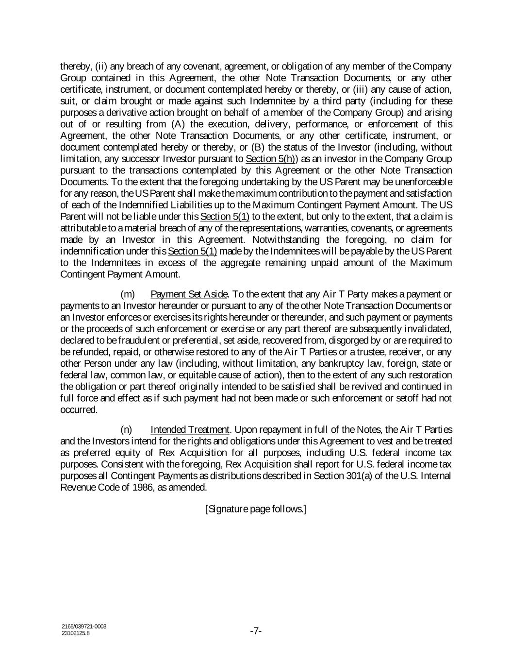 2165/039721-0003 23102125.8 -7- thereby, (ii) any breach of any covenant, agreement, or obligation of any member of the Company Group contained in this Agreement, the other Note Transaction Documents, or any other certificate, instrument, or document contemplated hereby or thereby, or (iii) any cause of action, suit, or claim brought or made against such Indemnitee by a third party (including for these purposes a derivative action brought on behalf of a member of the Company Group) and arising out of or resulting from (A) the execution, delivery, performance, or enforcement of this Agreement, the other Note Transaction Documents, or any other certificate, instrument, or document contemplated hereby or thereby, or (B) the status of the Investor (including, without limitation, any successor Investor pursuant to Section 5(h)) as an investor in the Company Group pursuant to the transactions contemplated by this Agreement or the other Note Transaction Documents. To the extent that the foregoing undertaking by the US Parent may be unenforceable for any reason, the US Parent shall make the maximum contribution to the payment and satisfaction of each of the Indemnified Liabilities up to the Maximum Contingent Payment Amount. The US Parent will not be liable under this Section 5(1) to the extent, but only to the extent, that a claim is attributable to a material breach of any of the representations, warranties, covenants, or agreements made by an Investor in this Agreement. Notwithstanding the foregoing, no claim for indemnification under this Section 5(1) made by the Indemnitees will be payable by the US Parent to the Indemnitees in excess of the aggregate remaining unpaid amount of the Maximum Contingent Payment Amount. (m) Payment Set Aside. To the extent that any Air T Party makes a payment or payments to an Investor hereunder or pursuant to any of the other Note Transaction Documents or an Investor enforces or exercises its rights hereunder or thereunder, and such payment or payments or the proceeds of such enforcement or exercise or any part thereof are subsequently invalidated, declared to be fraudulent or preferential, set aside, recovered from, disgorged by or are required to be refunded, repaid, or otherwise restored to any of the Air T Parties or a trustee, receiver, or any other Person under any law (including, without limitation, any bankruptcy law, foreign, state or federal law, common law, or equitable cause of action), then to the extent of any such restoration the obligation or part thereof originally intended to be satisfied shall be revived and continued in full force and effect as if such payment had not been made or such enforcement or setoff had not occurred. (n) Intended Treatment. Upon repayment in full of the Notes, the Air T Parties and the Investors intend for the rights and obligations under this Agreement to vest and be treated as preferred equity of Rex Acquisition for all purposes, including U.S. federal income tax purposes. Consistent with the foregoing, Rex Acquisition shall report for U.S. federal income tax purposes all Contingent Payments as distributions described in Section 301(a) of the U.S. Internal Revenue Code of 1986, as amended. [Signature page follows.]