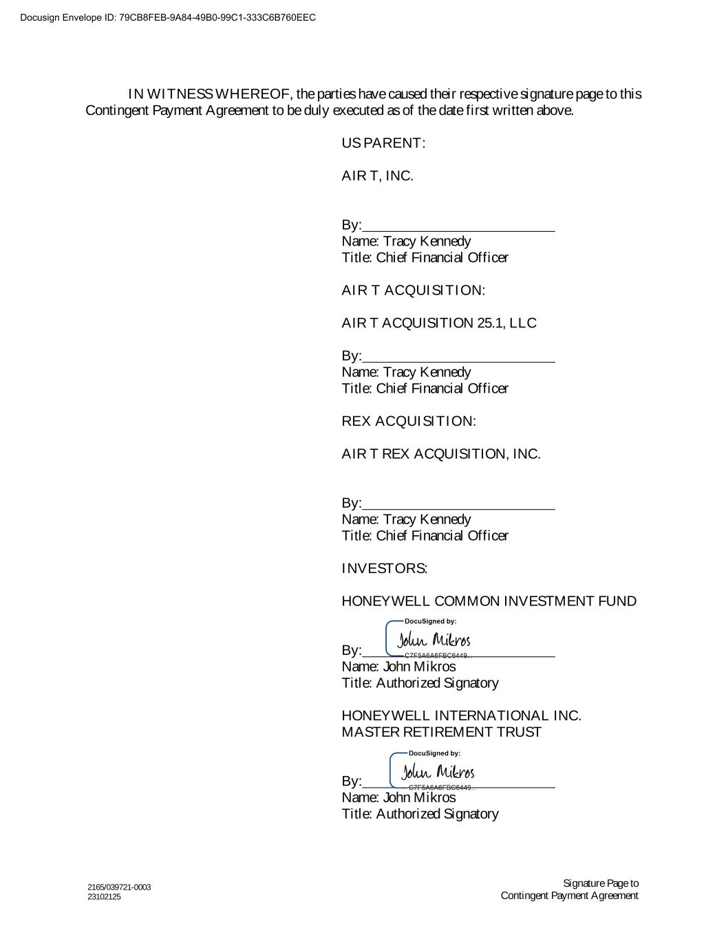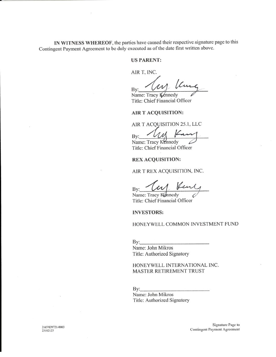 2165/039721-0003 23102125 Signature Page to Contingent Payment Agreement IN WITNESS WHEREOF, the parties have caused their respective signature page to this Contingent Payment Agreement to be duly executed as of the date first written above. US PARENT: AIR T, INC. By: Name: Tracy Kennedy Title: Chief Financial Officer AIR T ACQUISITION: AIR T ACQUISITION 25.1, LLC By: Name: Tracy Kennedy Title: Chief Financial Officer REX ACQUISITION: AIR T REX ACQUISITION, INC. By: Name: Tracy Kennedy Title: Chief Financial Officer INVESTORS: HONEYWELL COMMON INVESTMENT FUND By: Name: John Mikros Title: Authorized Signatory HONEYWELL INTERNATIONAL INC. MASTER RETIREMENT TRUST By: Name: John Mikros Title: Authorized Signatory Docusign Envelope ID: 79CB8FEB-9A84-49B0-99C1-333C6B760EEC