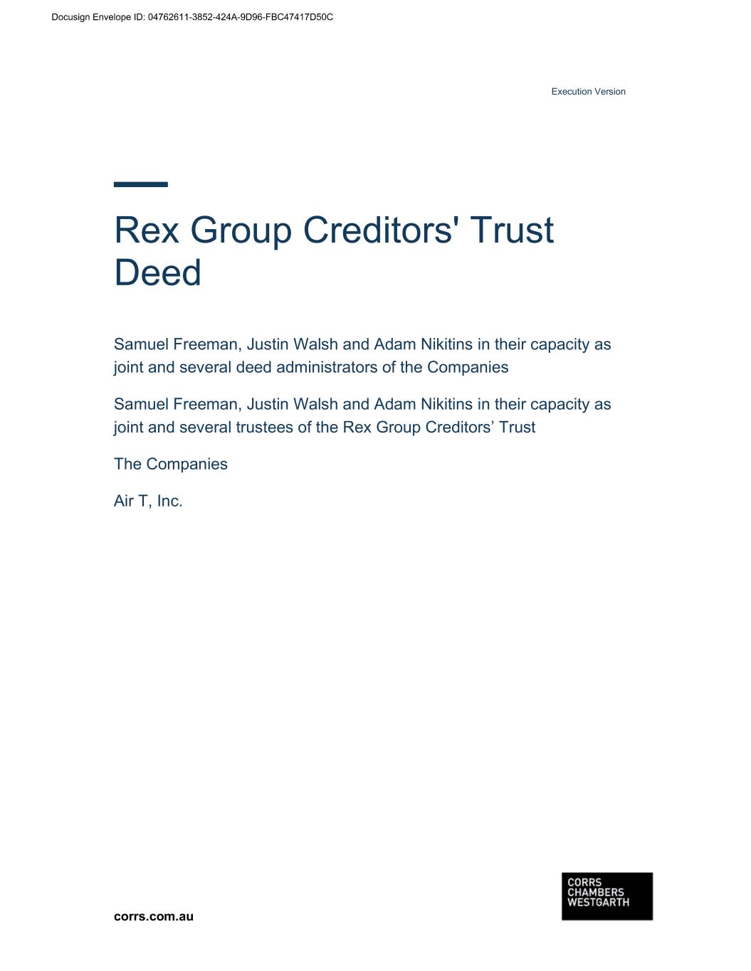 corrs.com.au Rex Group Creditors' Trust Deed Samuel Freeman, Justin Walsh and Adam Nikitins in their capacity as joint and several deed administrators of the Companies Samuel Freeman, Justin Walsh and Adam Nikitins in their capacity as joint and several trustees of the Rex Group Creditors’ Trust The Companies Air T, Inc. Execution Version