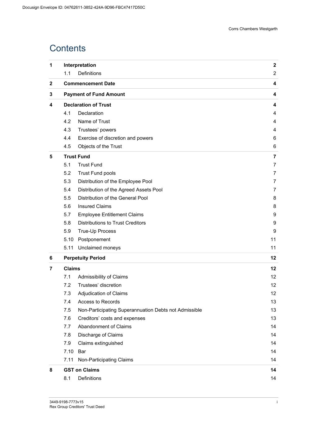 Corrs Chambers Westgarth 3449-9198-7773v15 i Rex Group Creditors' Trust Deed Contents 1 Interpretation 2 1.1 Definitions 2 2 Commencement Date 4 3 Payment of Fund Amount 4 4 Declaration of Trust 4 4.1 Declaration 4 4.2 Name of Trust 4 4.3 Trustees’ powers 4 4.4 Exercise of discretion and powers 6 4.5 Objects of the Trust 6 5 Trust Fund 7 5.1 Trust Fund 7 5.2 Trust Fund pools 7 5.3 Distribution of the Employee Pool 7 5.4 Distribution of the Agreed Assets Pool 7 5.5 Distribution of the General Pool 8 5.6 Insured Claims 8 5.7 Employee Entitlement Claims 9 5.8 Distributions to Trust Creditors 9 5.9 True-Up Process 9 5.10 Postponement 11 5.11 Unclaimed moneys 11 6 Perpetuity Period 12 7 Claims 12 7.1 Admissibility of Claims 12 7.2 Trustees’ discretion 12 7.3 Adjudication of Claims 12 7.4 Access to Records 13 7.5 Non-Participating Superannuation Debts not Admissible 13 7.6 Creditors’ costs and expenses 13 7.7 Abandonment of Claims 14 7.8 Discharge of Claims 14 7.9 Claims extinguished 14 7.10 Bar 14 7.11 Non-Participating Claims 14 8 GST on Claims 14 8.1 Definitions 14