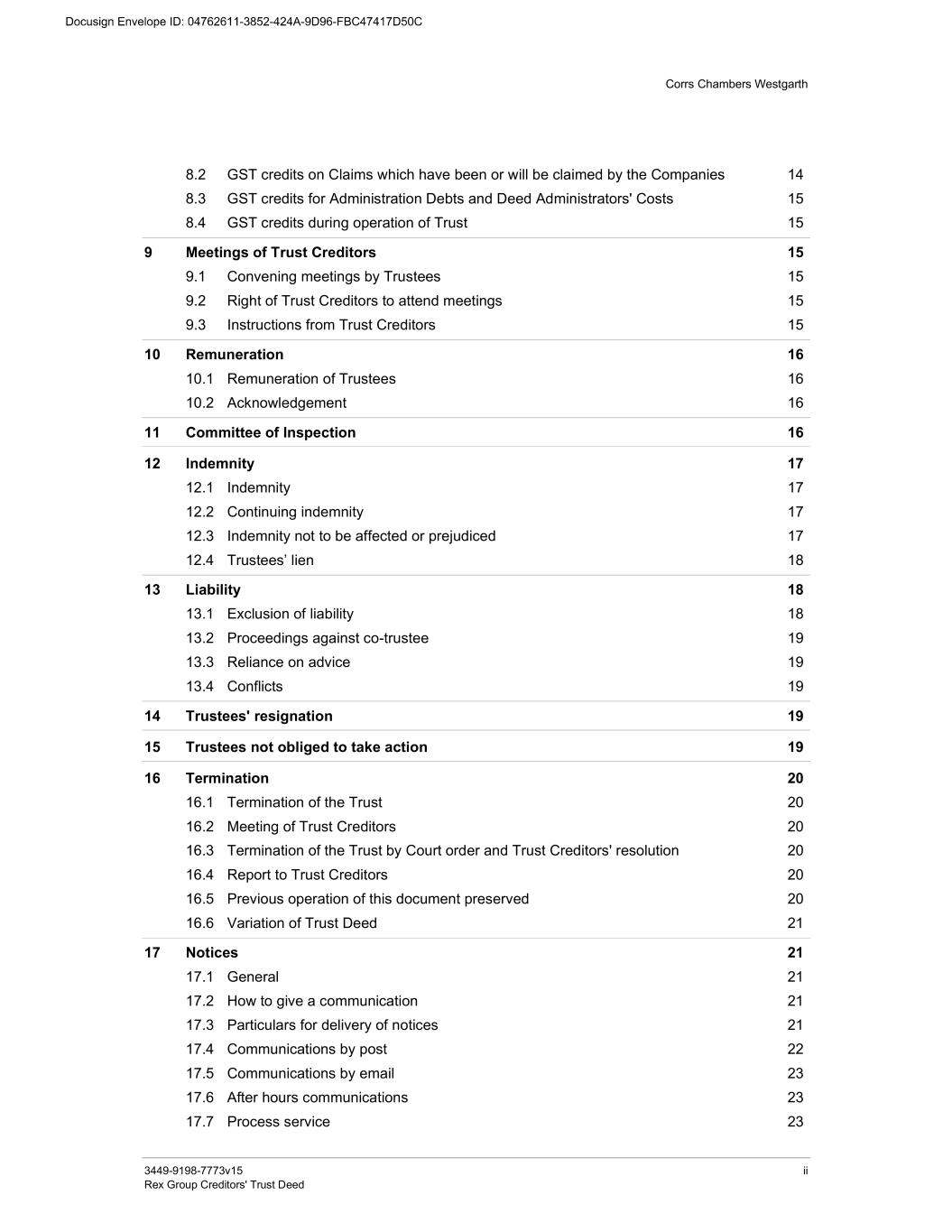 Corrs Chambers Westgarth 3449-9198-7773v15 ii Rex Group Creditors' Trust Deed 8.2 GST credits on Claims which have been or will be claimed by the Companies 14 8.3 GST credits for Administration Debts and Deed Administrators' Costs 15 8.4 GST credits during operation of Trust 15 9 Meetings of Trust Creditors 15 9.1 Convening meetings by Trustees 15 9.2 Right of Trust Creditors to attend meetings 15 9.3 Instructions from Trust Creditors 15 10 Remuneration 16 10.1 Remuneration of Trustees 16 10.2 Acknowledgement 16 11 Committee of Inspection 16 12 Indemnity 17 12.1 Indemnity 17 12.2 Continuing indemnity 17 12.3 Indemnity not to be affected or prejudiced 17 12.4 Trustees’ lien 18 13 Liability 18 13.1 Exclusion of liability 18 13.2 Proceedings against co-trustee 19 13.3 Reliance on advice 19 13.4 Conflicts 19 14 Trustees' resignation 19 15 Trustees not obliged to take action 19 16 Termination 20 16.1 Termination of the Trust 20 16.2 Meeting of Trust Creditors 20 16.3 Termination of the Trust by Court order and Trust Creditors' resolution 20 16.4 Report to Trust Creditors 20 16.5 Previous operation of this document preserved 20 16.6 Variation of Trust Deed 21 17 Notices 21 17.1 General 21 17.2 How to give a communication 21 17.3 Particulars for delivery of notices 21 17.4 Communications by post 22 17.5 Communications by email 23 17.6 After hours communications 23 17.7 Process service 23