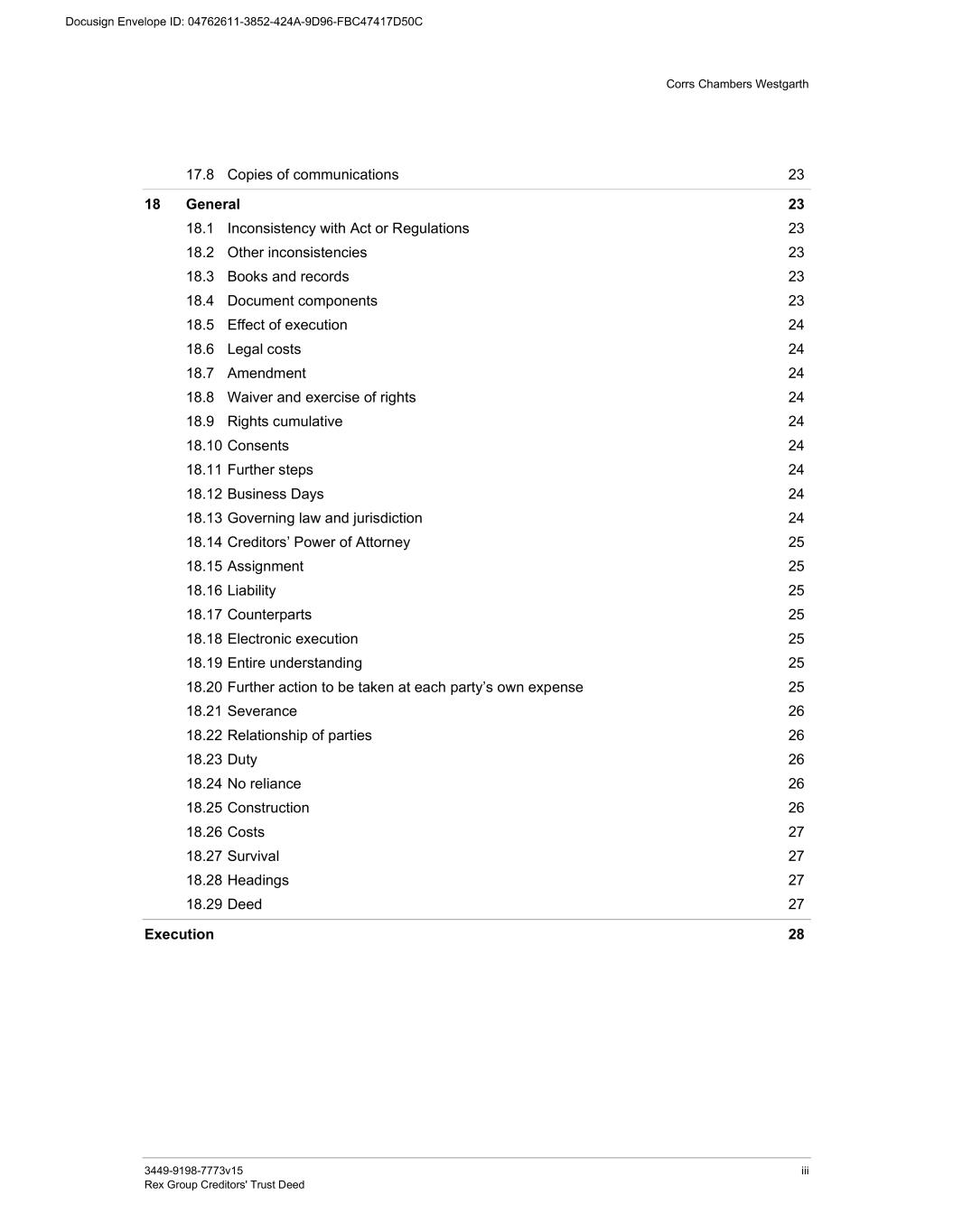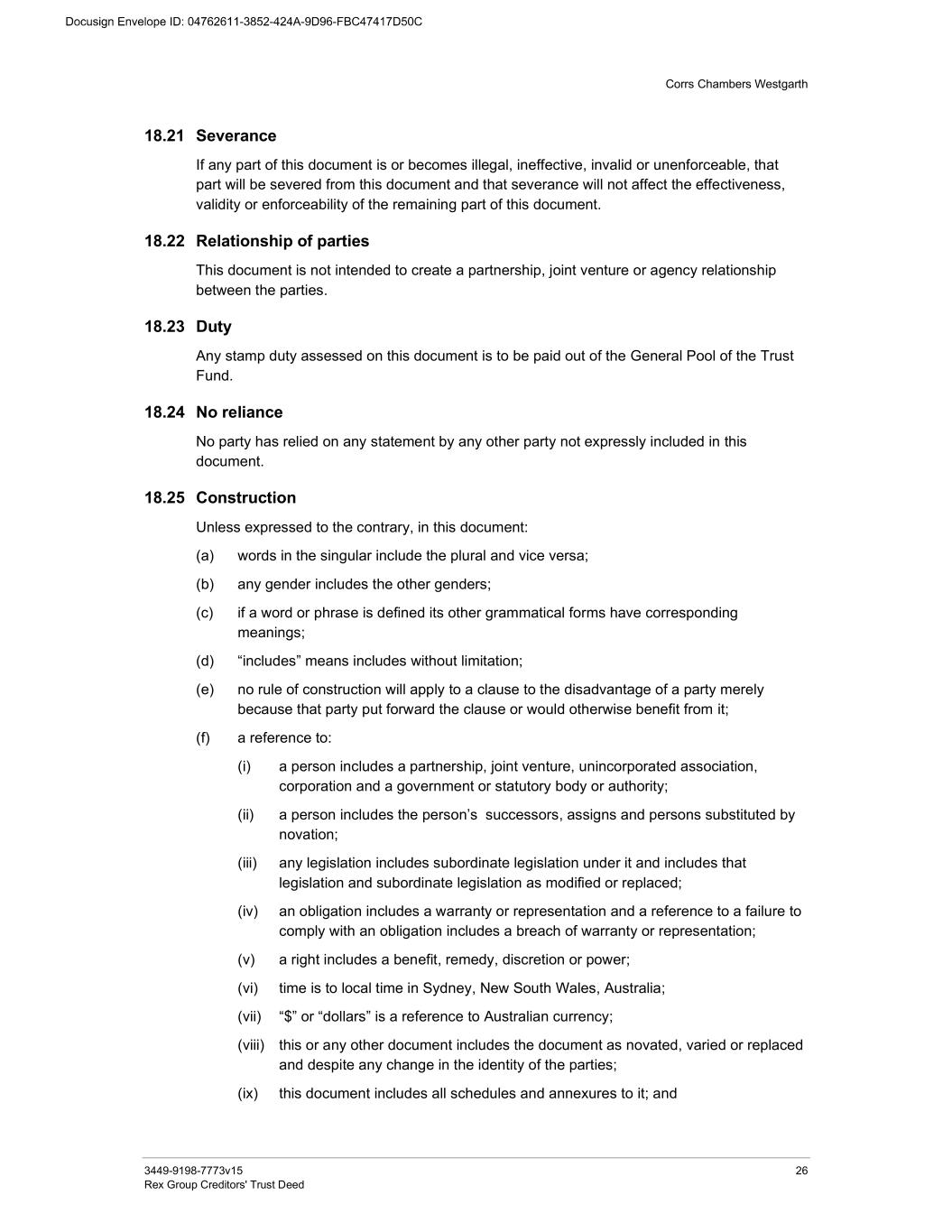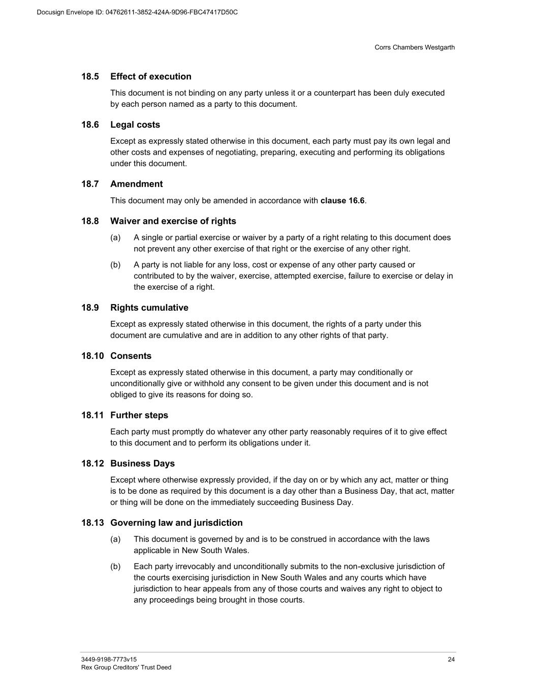 Corrs Chambers Westgarth 3449-9198-7773v15 iii Rex Group Creditors' Trust Deed 17.8 Copies of communications 23 18 General 23 18.1 Inconsistency with Act or Regulations 23 18.2 Other inconsistencies 23 18.3 Books and records 23 18.4 Document components 23 18.5 Effect of execution 24 18.6 Legal costs 24 18.7 Amendment 24 18.8 Waiver and exercise of rights 24 18.9 Rights cumulative 24 18.10 Consents 24 18.11 Further steps 24 18.12 Business Days 24 18.13 Governing law and jurisdiction 24 18.14 Creditors’ Power of Attorney 25 18.15 Assignment 25 18.16 Liability 25 18.17 Counterparts 25 18.18 Electronic execution 25 18.19 Entire understanding 25 18.20 Further action to be taken at each party’s own expense 25 18.21 Severance 26 18.22 Relationship of parties 26 18.23 Duty 26 18.24 No reliance 26 18.25 Construction 26 18.26 Costs 27 18.27 Survival 27 18.28 Headings 27 18.29 Deed 27 Execution 28