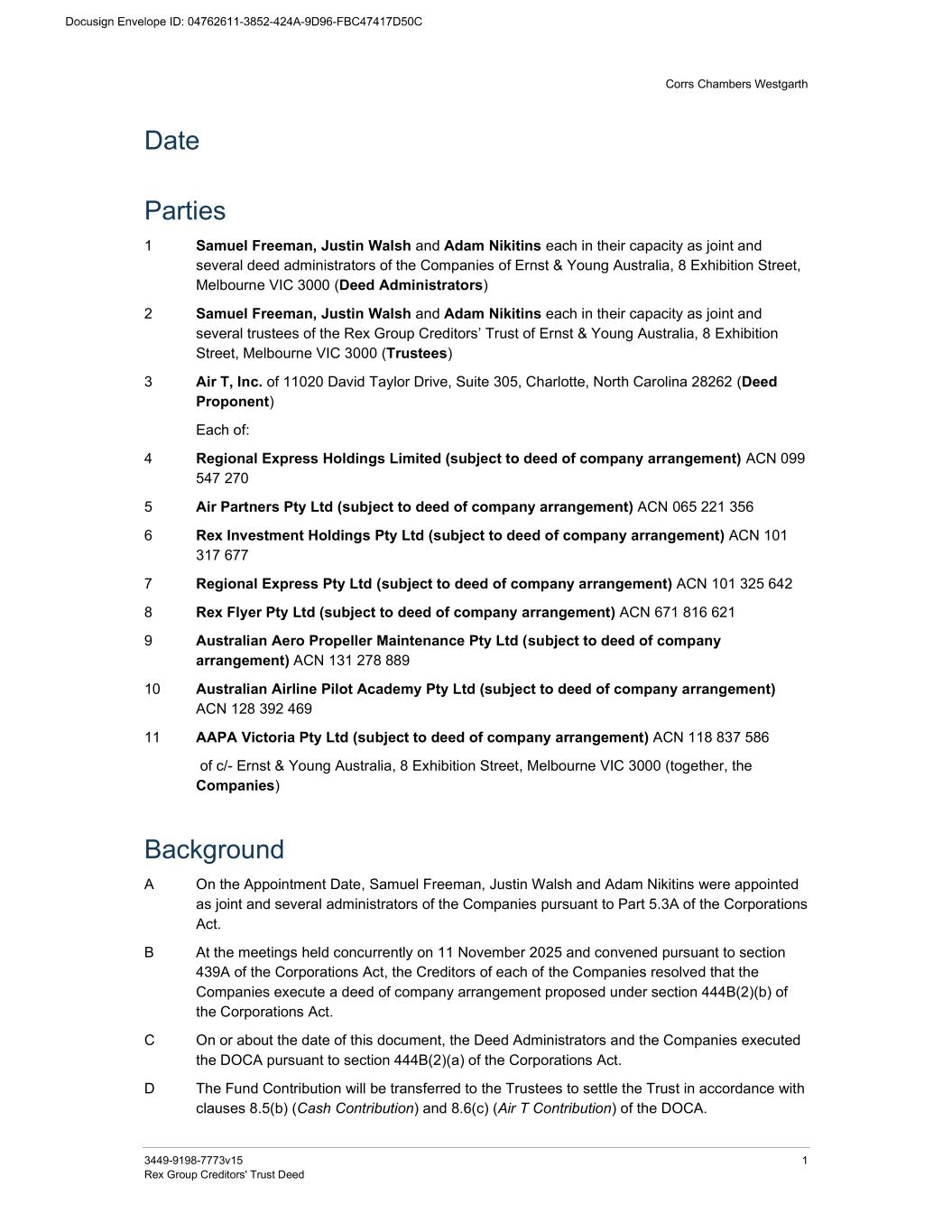 Corrs Chambers Westgarth 3449-9198-7773v15 1 Rex Group Creditors' Trust Deed Date Parties 1 Samuel Freeman, Justin Walsh and Adam Nikitins each in their capacity as joint and several deed administrators of the Companies of Ernst & Young Australia, 8 Exhibition Street, Melbourne VIC 3000 (Deed Administrators) 2 Samuel Freeman, Justin Walsh and Adam Nikitins each in their capacity as joint and several trustees of the Rex Group Creditors’ Trust of Ernst & Young Australia, 8 Exhibition Street, Melbourne VIC 3000 (Trustees) 3 Air T, Inc. of 11020 David Taylor Drive, Suite 305, Charlotte, North Carolina 28262 (Deed Proponent) Each of: 4 Regional Express Holdings Limited (subject to deed of company arrangement) ACN 099 547 270 5 Air Partners Pty Ltd (subject to deed of company arrangement) ACN 065 221 356 6 Rex Investment Holdings Pty Ltd (subject to deed of company arrangement) ACN 101 317 677 7 Regional Express Pty Ltd (subject to deed of company arrangement) ACN 101 325 642 8 Rex Flyer Pty Ltd (subject to deed of company arrangement) ACN 671 816 621 9 Australian Aero Propeller Maintenance Pty Ltd (subject to deed of company arrangement) ACN 131 278 889 10 Australian Airline Pilot Academy Pty Ltd (subject to deed of company arrangement) ACN 128 392 469 11 AAPA Victoria Pty Ltd (subject to deed of company arrangement) ACN 118 837 586 of c/- Ernst & Young Australia, 8 Exhibition Street, Melbourne VIC 3000 (together, the Companies) Background A On the Appointment Date, Samuel Freeman, Justin Walsh and Adam Nikitins were appointed as joint and several administrators of the Companies pursuant to Part 5.3A of the Corporations Act. B At the meetings held concurrently on 11 November 2025 and convened pursuant to section 439A of the Corporations Act, the Creditors of each of the Companies resolved that the Companies execute a deed of company arrangement proposed under section 444B(2)(b) of the Corporations Act. C On or about the date of this document, the Deed Administrators and the Companies executed the DOCA pursuant to section 444B(2)(a) of the Corporations Act. D The Fund Contribution will be transferred to the Trustees to settle the Trust in accordance with clauses 8.5(b) (Cash Contribution) and 8.6(c) (Air T Contribution) of the DOCA.