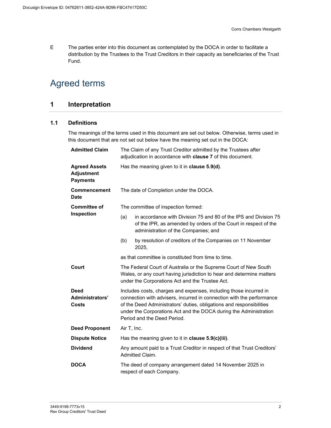 Corrs Chambers Westgarth 3449-9198-7773v15 2 Rex Group Creditors' Trust Deed E The parties enter into this document as contemplated by the DOCA in order to facilitate a distribution by the Trustees to the Trust Creditors in their capacity as beneficiaries of the Trust Fund. Agreed terms 1 Interpretation 1.1 Definitions The meanings of the terms used in this document are set out below. Otherwise, terms used in this document that are not set out below have the meaning set out in the DOCA: Admitted Claim The Claim of any Trust Creditor admitted by the Trustees after adjudication in accordance with clause 7 of this document. Agreed Assets Adjustment Payments Has the meaning given to it in clause 5.9(d). Commencement Date The date of Completion under the DOCA. Committee of Inspection The committee of inspection formed: (a) in accordance with Division 75 and 80 of the IPS and Division 75 of the IPR, as amended by orders of the Court in respect of the administration of the Companies; and (b) by resolution of creditors of the Companies on 11 November 2025, as that committee is constituted from time to time. Court The Federal Court of Australia or the Supreme Court of New South Wales, or any court having jurisdiction to hear and determine matters under the Corporations Act and the Trustee Act. Deed Administrators’ Costs Includes costs, charges and expenses, including those incurred in connection with advisers, incurred in connection with the performance of the Deed Administrators’ duties, obligations and responsibilities under the Corporations Act and the DOCA during the Administration Period and the Deed Period. Deed Proponent Air T, Inc. Dispute Notice Has the meaning given to it in clause 5.9(c)(iii). Dividend Any amount paid to a Trust Creditor in respect of that Trust Creditors’ Admitted Claim. DOCA The deed of company arrangement dated 14 November 2025 in respect of each Company.