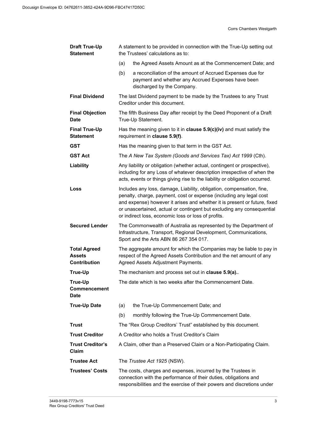 Corrs Chambers Westgarth 3449-9198-7773v15 3 Rex Group Creditors' Trust Deed Draft True-Up Statement A statement to be provided in connection with the True-Up setting out the Trustees’ calculations as to: (a) the Agreed Assets Amount as at the Commencement Date; and (b) a reconciliation of the amount of Accrued Expenses due for payment and whether any Accrued Expenses have been discharged by the Company. Final Dividend The last Dividend payment to be made by the Trustees to any Trust Creditor under this document. Final Objection Date The fifth Business Day after receipt by the Deed Proponent of a Draft True-Up Statement. Final True-Up Statement Has the meaning given to it in clause 5.9(c)(iv) and must satisfy the requirement in clause 5.9(f). GST Has the meaning given to that term in the GST Act. GST Act The A New Tax System (Goods and Services Tax) Act 1999 (Cth). Liability Any liability or obligation (whether actual, contingent or prospective), including for any Loss of whatever description irrespective of when the acts, events or things giving rise to the liability or obligation occurred. Loss Includes any loss, damage, Liability, obligation, compensation, fine, penalty, charge, payment, cost or expense (including any legal cost and expense) however it arises and whether it is present or future, fixed or unascertained, actual or contingent but excluding any consequential or indirect loss, economic loss or loss of profits. Secured Lender The Commonwealth of Australia as represented by the Department of Infrastructure, Transport, Regional Development, Communications, Sport and the Arts ABN 86 267 354 017. Total Agreed Assets Contribution The aggregate amount for which the Companies may be liable to pay in respect of the Agreed Assets Contribution and the net amount of any Agreed Assets Adjustment Payments. True-Up The mechanism and process set out in clause 5.9(a).. True-Up Commencement Date The date which is two weeks after the Commencement Date. True-Up Date (a) the True-Up Commencement Date; and (b) monthly following the True-Up Commencement Date. Trust The “Rex Group Creditors’ Trust” established by this document. Trust Creditor A Creditor who holds a Trust Creditor’s Claim Trust Creditor’s Claim A Claim, other than a Preserved Claim or a Non-Participating Claim. Trustee Act The Trustee Act 1925 (NSW). Trustees’ Costs The costs, charges and expenses, incurred by the Trustees in connection with the performance of their duties, obligations and responsibilities and the exercise of their powers and discretions under