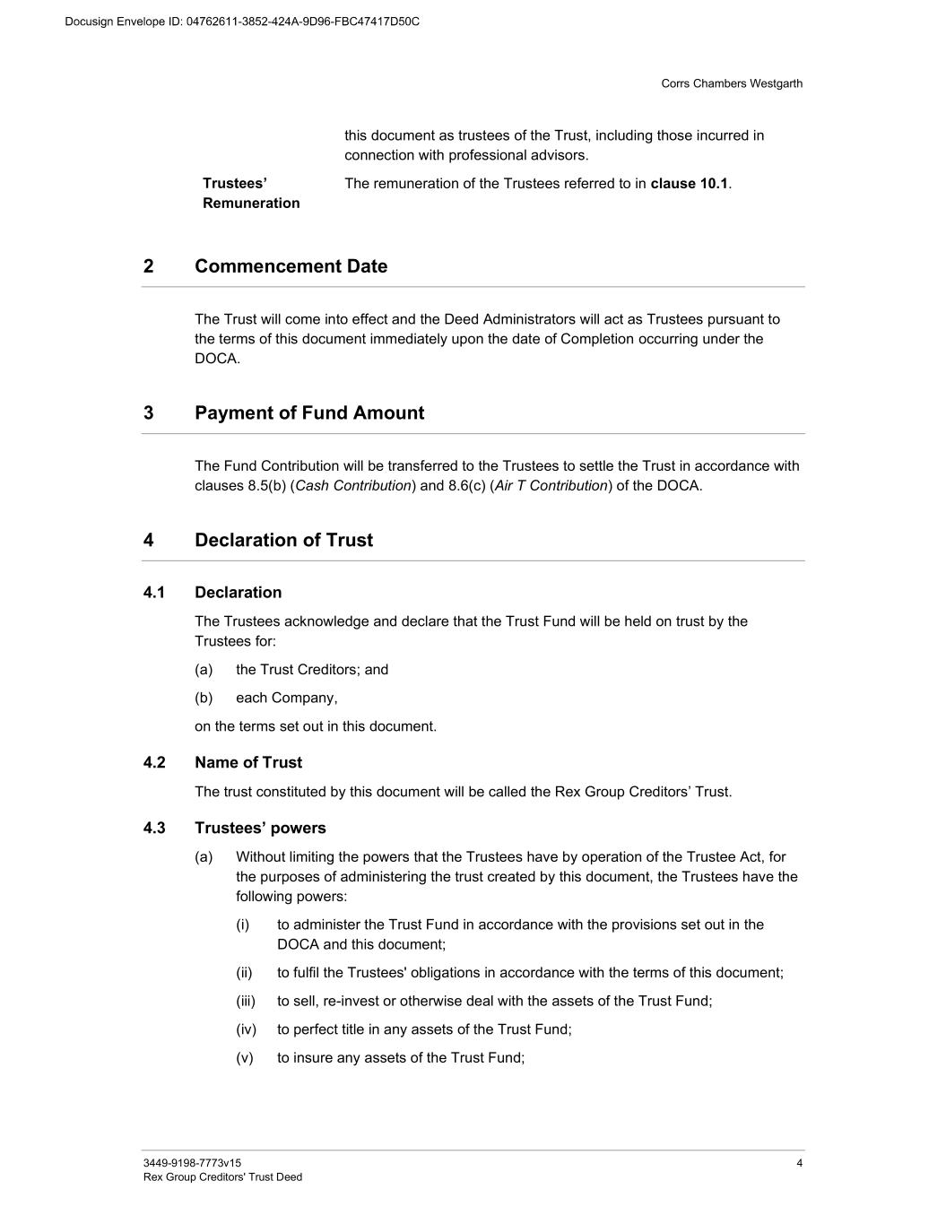 Corrs Chambers Westgarth 3449-9198-7773v15 4 Rex Group Creditors' Trust Deed this document as trustees of the Trust, including those incurred in connection with professional advisors. Trustees’ Remuneration The remuneration of the Trustees referred to in clause 10.1. 2 Commencement Date The Trust will come into effect and the Deed Administrators will act as Trustees pursuant to the terms of this document immediately upon the date of Completion occurring under the DOCA. 3 Payment of Fund Amount The Fund Contribution will be transferred to the Trustees to settle the Trust in accordance with clauses 8.5(b) (Cash Contribution) and 8.6(c) (Air T Contribution) of the DOCA. 4 Declaration of Trust 4.1 Declaration The Trustees acknowledge and declare that the Trust Fund will be held on trust by the Trustees for: (a) the Trust Creditors; and (b) each Company, on the terms set out in this document. 4.2 Name of Trust The trust constituted by this document will be called the Rex Group Creditors’ Trust. 4.3 Trustees’ powers (a) Without limiting the powers that the Trustees have by operation of the Trustee Act, for the purposes of administering the trust created by this document, the Trustees have the following powers: (i) to administer the Trust Fund in accordance with the provisions set out in the DOCA and this document; (ii) to fulfil the Trustees' obligations in accordance with the terms of this document; (iii) to sell, re-invest or otherwise deal with the assets of the Trust Fund; (iv) to perfect title in any assets of the Trust Fund; (v) to insure any assets of the Trust Fund;