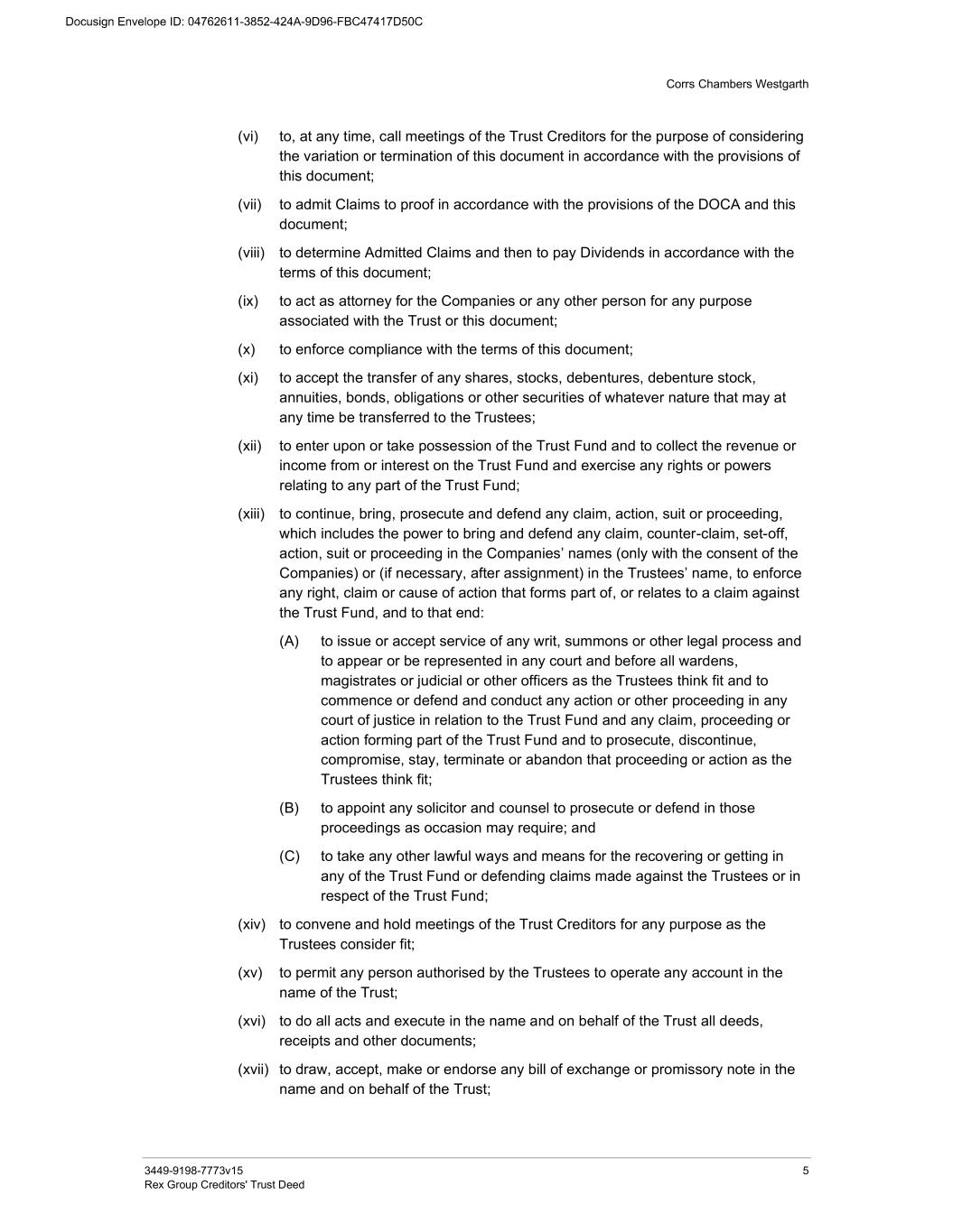 Corrs Chambers Westgarth 3449-9198-7773v15 5 Rex Group Creditors' Trust Deed (vi) to, at any time, call meetings of the Trust Creditors for the purpose of considering the variation or termination of this document in accordance with the provisions of this document; (vii) to admit Claims to proof in accordance with the provisions of the DOCA and this document; (viii) to determine Admitted Claims and then to pay Dividends in accordance with the terms of this document; (ix) to act as attorney for the Companies or any other person for any purpose associated with the Trust or this document; (x) to enforce compliance with the terms of this document; (xi) to accept the transfer of any shares, stocks, debentures, debenture stock, annuities, bonds, obligations or other securities of whatever nature that may at any time be transferred to the Trustees; (xii) to enter upon or take possession of the Trust Fund and to collect the revenue or income from or interest on the Trust Fund and exercise any rights or powers relating to any part of the Trust Fund; (xiii) to continue, bring, prosecute and defend any claim, action, suit or proceeding, which includes the power to bring and defend any claim, counter-claim, set-off, action, suit or proceeding in the Companies’ names (only with the consent of the Companies) or (if necessary, after assignment) in the Trustees’ name, to enforce any right, claim or cause of action that forms part of, or relates to a claim against the Trust Fund, and to that end: (A) to issue or accept service of any writ, summons or other legal process and to appear or be represented in any court and before all wardens, magistrates or judicial or other officers as the Trustees think fit and to commence or defend and conduct any action or other proceeding in any court of justice in relation to the Trust Fund and any claim, proceeding or action forming part of the Trust Fund and to prosecute, discontinue, compromise, stay, terminate or abandon that proceeding or action as the Trustees think fit; (B) to appoint any solicitor and counsel to prosecute or defend in those proceedings as occasion may require; and (C) to take any other lawful ways and means for the recovering or getting in any of the Trust Fund or defending claims made against the Trustees or in respect of the Trust Fund; (xiv) to convene and hold meetings of the Trust Creditors for any purpose as the Trustees consider fit; (xv) to permit any person authorised by the Trustees to operate any account in the name of the Trust; (xvi) to do all acts and execute in the name and on behalf of the Trust all deeds, receipts and other documents; (xvii) to draw, accept, make or endorse any bill of exchange or promissory note in the name and on behalf of the Trust;