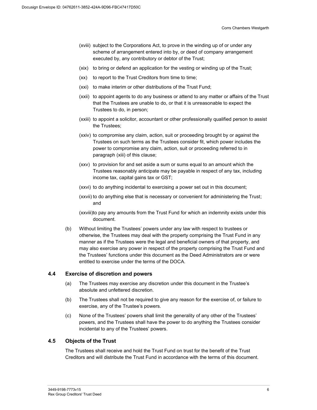 Corrs Chambers Westgarth 3449-9198-7773v15 6 Rex Group Creditors' Trust Deed (xviii) subject to the Corporations Act, to prove in the winding up of or under any scheme of arrangement entered into by, or deed of company arrangement executed by, any contributory or debtor of the Trust; (xix) to bring or defend an application for the vesting or winding up of the Trust; (xx) to report to the Trust Creditors from time to time; (xxi) to make interim or other distributions of the Trust Fund; (xxii) to appoint agents to do any business or attend to any matter or affairs of the Trust that the Trustees are unable to do, or that it is unreasonable to expect the Trustees to do, in person; (xxiii) to appoint a solicitor, accountant or other professionally qualified person to assist the Trustees; (xxiv) to compromise any claim, action, suit or proceeding brought by or against the Trustees on such terms as the Trustees consider fit, which power includes the power to compromise any claim, action, suit or proceeding referred to in paragraph (xiii) of this clause; (xxv) to provision for and set aside a sum or sums equal to an amount which the Trustees reasonably anticipate may be payable in respect of any tax, including income tax, capital gains tax or GST; (xxvi) to do anything incidental to exercising a power set out in this document; (xxvii) to do anything else that is necessary or convenient for administering the Trust; and (xxviii)to pay any amounts from the Trust Fund for which an indemnity exists under this document. (b) Without limiting the Trustees’ powers under any law with respect to trustees or otherwise, the Trustees may deal with the property comprising the Trust Fund in any manner as if the Trustees were the legal and beneficial owners of that property, and may also exercise any power in respect of the property comprising the Trust Fund and the Trustees’ functions under this document as the Deed Administrators are or were entitled to exercise under the terms of the DOCA. 4.4 Exercise of discretion and powers (a) The Trustees may exercise any discretion under this document in the Trustee’s absolute and unfettered discretion. (b) The Trustees shall not be required to give any reason for the exercise of, or failure to exercise, any of the Trustee’s powers. (c) None of the Trustees’ powers shall limit the generality of any other of the Trustees’ powers, and the Trustees shall have the power to do anything the Trustees consider incidental to any of the Trustees’ powers. 4.5 Objects of the Trust The Trustees shall receive and hold the Trust Fund on trust for the benefit of the Trust Creditors and will distribute the Trust Fund in accordance with the terms of this document.