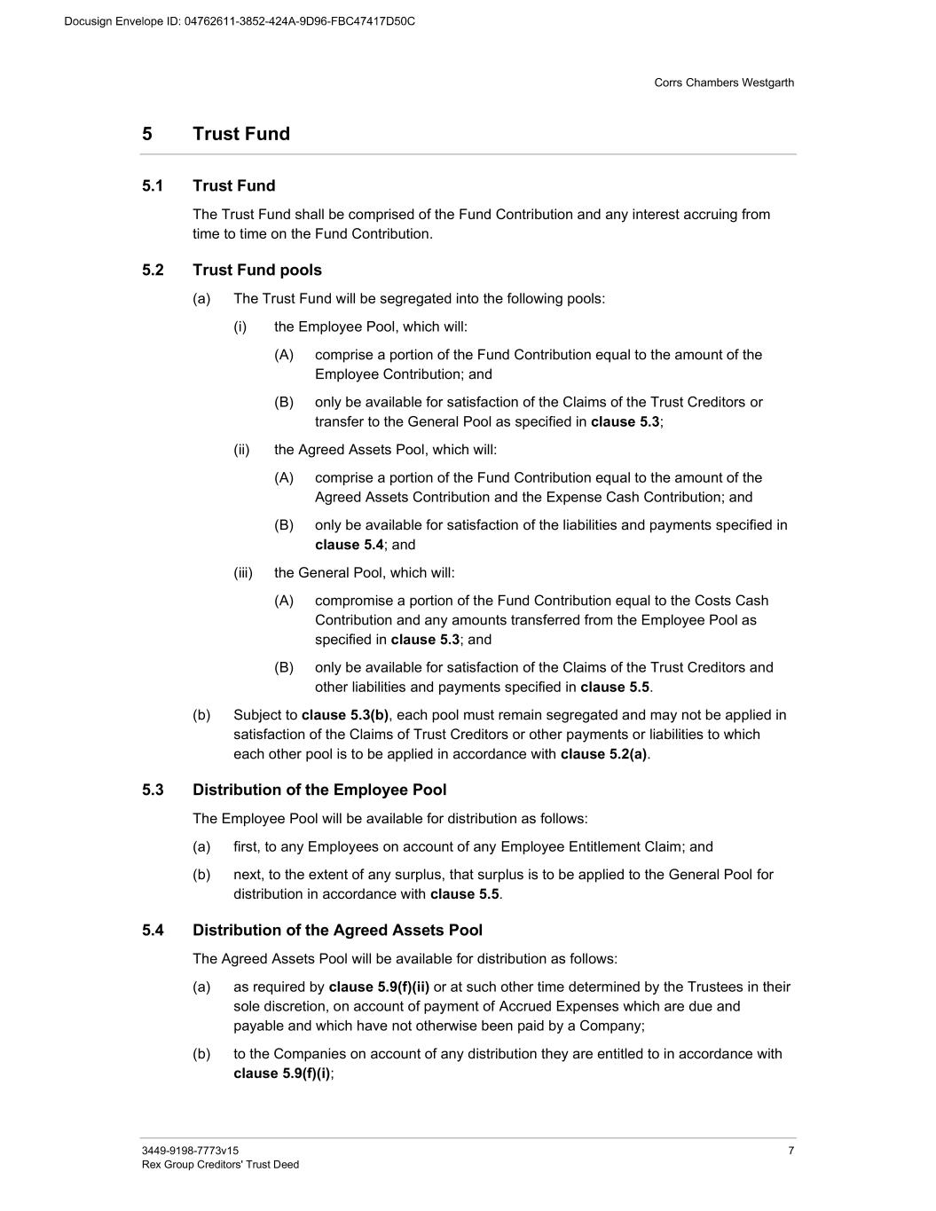 Corrs Chambers Westgarth 3449-9198-7773v15 7 Rex Group Creditors' Trust Deed 5 Trust Fund 5.1 Trust Fund The Trust Fund shall be comprised of the Fund Contribution and any interest accruing from time to time on the Fund Contribution. 5.2 Trust Fund pools (a) The Trust Fund will be segregated into the following pools: (i) the Employee Pool, which will: (A) comprise a portion of the Fund Contribution equal to the amount of the Employee Contribution; and (B) only be available for satisfaction of the Claims of the Trust Creditors or transfer to the General Pool as specified in clause 5.3; (ii) the Agreed Assets Pool, which will: (A) comprise a portion of the Fund Contribution equal to the amount of the Agreed Assets Contribution and the Expense Cash Contribution; and (B) only be available for satisfaction of the liabilities and payments specified in clause 5.4; and (iii) the General Pool, which will: (A) compromise a portion of the Fund Contribution equal to the Costs Cash Contribution and any amounts transferred from the Employee Pool as specified in clause 5.3; and (B) only be available for satisfaction of the Claims of the Trust Creditors and other liabilities and payments specified in clause 5.5. (b) Subject to clause 5.3(b), each pool must remain segregated and may not be applied in satisfaction of the Claims of Trust Creditors or other payments or liabilities to which each other pool is to be applied in accordance with clause 5.2(a). 5.3 Distribution of the Employee Pool The Employee Pool will be available for distribution as follows: (a) first, to any Employees on account of any Employee Entitlement Claim; and (b) next, to the extent of any surplus, that surplus is to be applied to the General Pool for distribution in accordance with clause 5.5. 5.4 Distribution of the Agreed Assets Pool The Agreed Assets Pool will be available for distribution as follows: (a) as required by clause 5.9(f)(ii) or at such other time determined by the Trustees in their sole discretion, on account of payment of Accrued Expenses which are due and payable and which have not otherwise been paid by a Company; (b) to the Companies on account of any distribution they are entitled to in accordance with clause 5.9(f)(i);