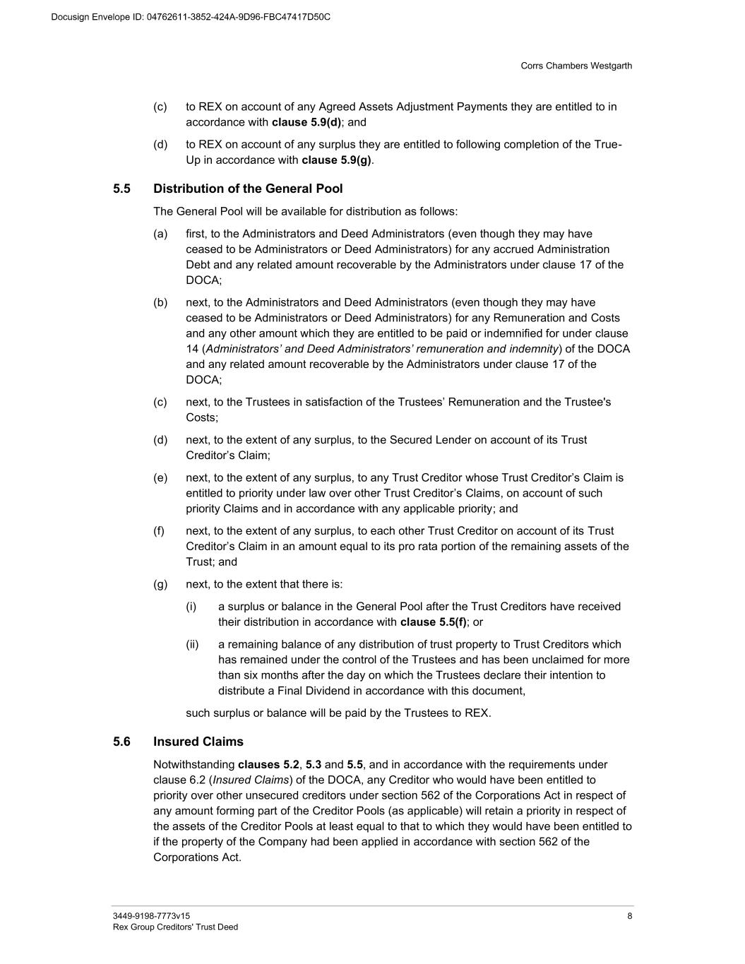 Corrs Chambers Westgarth 3449-9198-7773v15 8 Rex Group Creditors' Trust Deed (c) to REX on account of any Agreed Assets Adjustment Payments they are entitled to in accordance with clause 5.9(d); and (d) to REX on account of any surplus they are entitled to following completion of the True- Up in accordance with clause 5.9(g). 5.5 Distribution of the General Pool The General Pool will be available for distribution as follows: (a) first, to the Administrators and Deed Administrators (even though they may have ceased to be Administrators or Deed Administrators) for any accrued Administration Debt and any related amount recoverable by the Administrators under clause 17 of the DOCA; (b) next, to the Administrators and Deed Administrators (even though they may have ceased to be Administrators or Deed Administrators) for any Remuneration and Costs and any other amount which they are entitled to be paid or indemnified for under clause 14 (Administrators’ and Deed Administrators’ remuneration and indemnity) of the DOCA and any related amount recoverable by the Administrators under clause 17 of the DOCA; (c) next, to the Trustees in satisfaction of the Trustees’ Remuneration and the Trustee's Costs; (d) next, to the extent of any surplus, to the Secured Lender on account of its Trust Creditor’s Claim; (e) next, to the extent of any surplus, to any Trust Creditor whose Trust Creditor’s Claim is entitled to priority under law over other Trust Creditor’s Claims, on account of such priority Claims and in accordance with any applicable priority; and (f) next, to the extent of any surplus, to each other Trust Creditor on account of its Trust Creditor’s Claim in an amount equal to its pro rata portion of the remaining assets of the Trust; and (g) next, to the extent that there is: (i) a surplus or balance in the General Pool after the Trust Creditors have received their distribution in accordance with clause 5.5(f); or (ii) a remaining balance of any distribution of trust property to Trust Creditors which has remained under the control of the Trustees and has been unclaimed for more than six months after the day on which the Trustees declare their intention to distribute a Final Dividend in accordance with this document, such surplus or balance will be paid by the Trustees to REX. 5.6 Insured Claims Notwithstanding clauses 5.2, 5.3 and 5.5, and in accordance with the requirements under clause 6.2 (Insured Claims) of the DOCA, any Creditor who would have been entitled to priority over other unsecured creditors under section 562 of the Corporations Act in respect of any amount forming part of the Creditor Pools (as applicable) will retain a priority in respect of the assets of the Creditor Pools at least equal to that to which they would have been entitled to if the property of the Company had been applied in accordance with section 562 of the Corporations Act.