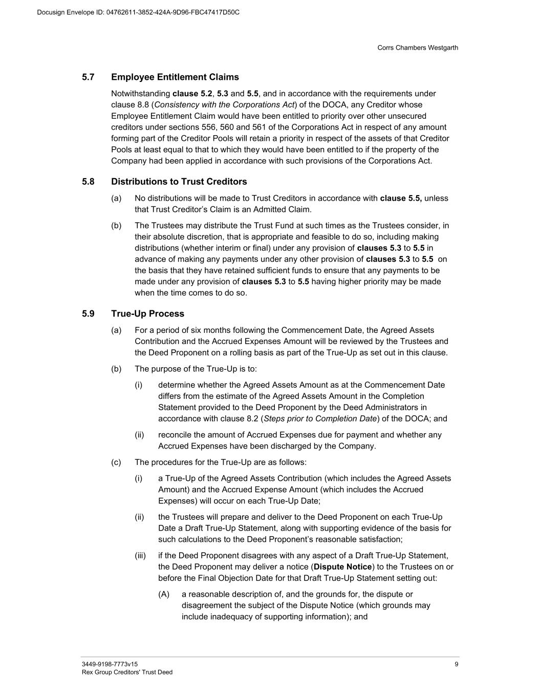 Corrs Chambers Westgarth 3449-9198-7773v15 9 Rex Group Creditors' Trust Deed 5.7 Employee Entitlement Claims Notwithstanding clause 5.2, 5.3 and 5.5, and in accordance with the requirements under clause 8.8 (Consistency with the Corporations Act) of the DOCA, any Creditor whose Employee Entitlement Claim would have been entitled to priority over other unsecured creditors under sections 556, 560 and 561 of the Corporations Act in respect of any amount forming part of the Creditor Pools will retain a priority in respect of the assets of that Creditor Pools at least equal to that to which they would have been entitled to if the property of the Company had been applied in accordance with such provisions of the Corporations Act. 5.8 Distributions to Trust Creditors (a) No distributions will be made to Trust Creditors in accordance with clause 5.5, unless that Trust Creditor’s Claim is an Admitted Claim. (b) The Trustees may distribute the Trust Fund at such times as the Trustees consider, in their absolute discretion, that is appropriate and feasible to do so, including making distributions (whether interim or final) under any provision of clauses 5.3 to 5.5 in advance of making any payments under any other provision of clauses 5.3 to 5.5 on the basis that they have retained sufficient funds to ensure that any payments to be made under any provision of clauses 5.3 to 5.5 having higher priority may be made when the time comes to do so. 5.9 True-Up Process (a) For a period of six months following the Commencement Date, the Agreed Assets Contribution and the Accrued Expenses Amount will be reviewed by the Trustees and the Deed Proponent on a rolling basis as part of the True-Up as set out in this clause. (b) The purpose of the True-Up is to: (i) determine whether the Agreed Assets Amount as at the Commencement Date differs from the estimate of the Agreed Assets Amount in the Completion Statement provided to the Deed Proponent by the Deed Administrators in accordance with clause 8.2 (Steps prior to Completion Date) of the DOCA; and (ii) reconcile the amount of Accrued Expenses due for payment and whether any Accrued Expenses have been discharged by the Company. (c) The procedures for the True-Up are as follows: (i) a True-Up of the Agreed Assets Contribution (which includes the Agreed Assets Amount) and the Accrued Expense Amount (which includes the Accrued Expenses) will occur on each True-Up Date; (ii) the Trustees will prepare and deliver to the Deed Proponent on each True-Up Date a Draft True-Up Statement, along with supporting evidence of the basis for such calculations to the Deed Proponent’s reasonable satisfaction; (iii) if the Deed Proponent disagrees with any aspect of a Draft True-Up Statement, the Deed Proponent may deliver a notice (Dispute Notice) to the Trustees on or before the Final Objection Date for that Draft True-Up Statement setting out: (A) a reasonable description of, and the grounds for, the dispute or disagreement the subject of the Dispute Notice (which grounds may include inadequacy of supporting information); and