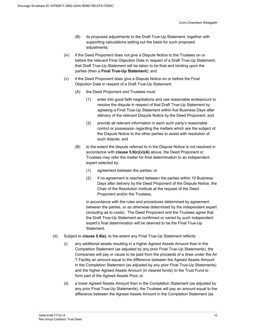 Corrs Chambers Westgarth 3449-9198-7773v15 10 Rex Group Creditors' Trust Deed (B) its proposed adjustments to the Draft True-Up Statement, together with supporting calculations setting out the basis for such proposed adjustments; (iv) if the Deed Proponent does not give a Dispute Notice to the Trustees on or before the relevant Final Objection Date in respect of a Draft True-Up Statement, that Draft True-Up Statement will be taken to be final and binding upon the parties (then a Final True-Up Statement); and (v) if the Deed Proponent does give a Dispute Notice on or before the Final Objection Date in respect of a Draft True-Up Statement: (A) the Deed Proponent and Trustees must: (1) enter into good faith negotiations and use reasonable endeavours to resolve the dispute in respect of that Draft True-Up Statement by agreeing a Final True-Up Statement within five Business Days after delivery of the relevant Dispute Notice by the Deed Proponent; and (2) provide all relevant information in each such party’s reasonable control or possession regarding the matters which are the subject of the Dispute Notice to the other parties to assist with resolution of such dispute; and (B) to the extent the dispute referred to in the Dispute Notice is not resolved in accordance with clause 5.9(c)(v)(A) above, the Deed Proponent or Trustees may refer the matter for final determination to an independent expert selected by: (1) agreement between the parties; or (2) if no agreement is reached between the parties within 10 Business Days after delivery by the Deed Proponent of the Dispute Notice, the Chair of the Resolution Institute at the request of the Deed Proponent and/or the Trustees, in accordance with the rules and procedures determined by agreement between the parties, or as otherwise determined by the independent expert (including as to costs). The Deed Proponent and the Trustees agree that the Draft True-Up Statement as confirmed or varied by such independent expert’s final determination will be deemed to be the Final True-Up Statement. (d) Subject to clause 5.9(e), to the extent any Final True-Up Statement reflects: (i) any additional assets resulting in a higher Agreed Assets Amount than in the Completion Statement (as adjusted by any prior Final True-Up Statements), the Companies will pay or cause to be paid from the proceeds of a draw under the Air T Facility an amount equal to the difference between the Agreed Assets Amount in the Completion Statement (as adjusted by any prior Final True-Up Statements) and the higher Agreed Assets Amount (in cleared funds) to the Trust Fund to form part of the Agreed Assets Pool; or (ii) a lower Agreed Assets Amount than in the Completion Statement (as adjusted by any prior Final True-Up Statements), the Trustees will pay an amount equal to the difference between the Agreed Assets Amount in the Completion Statement (as