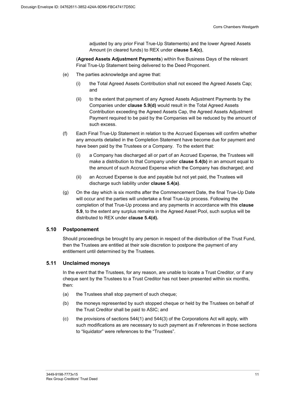 Corrs Chambers Westgarth 3449-9198-7773v15 11 Rex Group Creditors' Trust Deed adjusted by any prior Final True-Up Statements) and the lower Agreed Assets Amount (in cleared funds) to REX under clause 5.4(c), (Agreed Assets Adjustment Payments) within five Business Days of the relevant Final True-Up Statement being delivered to the Deed Proponent. (e) The parties acknowledge and agree that: (i) the Total Agreed Assets Contribution shall not exceed the Agreed Assets Cap; and (ii) to the extent that payment of any Agreed Assets Adjustment Payments by the Companies under clause 5.9(d) would result in the Total Agreed Assets Contribution exceeding the Agreed Assets Cap, the Agreed Assets Adjustment Payment required to be paid by the Companies will be reduced by the amount of such excess. (f) Each Final True-Up Statement in relation to the Accrued Expenses will confirm whether any amounts detailed in the Completion Statement have become due for payment and have been paid by the Trustees or a Company. To the extent that: (i) a Company has discharged all or part of an Accrued Expense, the Trustees will make a distribution to that Company under clause 5.4(b) in an amount equal to the amount of such Accrued Expense which the Company has discharged; and (ii) an Accrued Expense is due and payable but not yet paid, the Trustees will discharge such liability under clause 5.4(a). (g) On the day which is six months after the Commencement Date, the final True-Up Date will occur and the parties will undertake a final True-Up process. Following the completion of that True-Up process and any payments in accordance with this clause 5.9, to the extent any surplus remains in the Agreed Asset Pool, such surplus will be distributed to REX under clause 5.4(d). 5.10 Postponement Should proceedings be brought by any person in respect of the distribution of the Trust Fund, then the Trustees are entitled at their sole discretion to postpone the payment of any entitlement until determined by the Trustees. 5.11 Unclaimed moneys In the event that the Trustees, for any reason, are unable to locate a Trust Creditor, or if any cheque sent by the Trustees to a Trust Creditor has not been presented within six months, then: (a) the Trustees shall stop payment of such cheque; (b) the moneys represented by such stopped cheque or held by the Trustees on behalf of the Trust Creditor shall be paid to ASIC; and (c) the provisions of sections 544(1) and 544(3) of the Corporations Act will apply, with such modifications as are necessary to such payment as if references in those sections to “liquidator” were references to the “Trustees”.