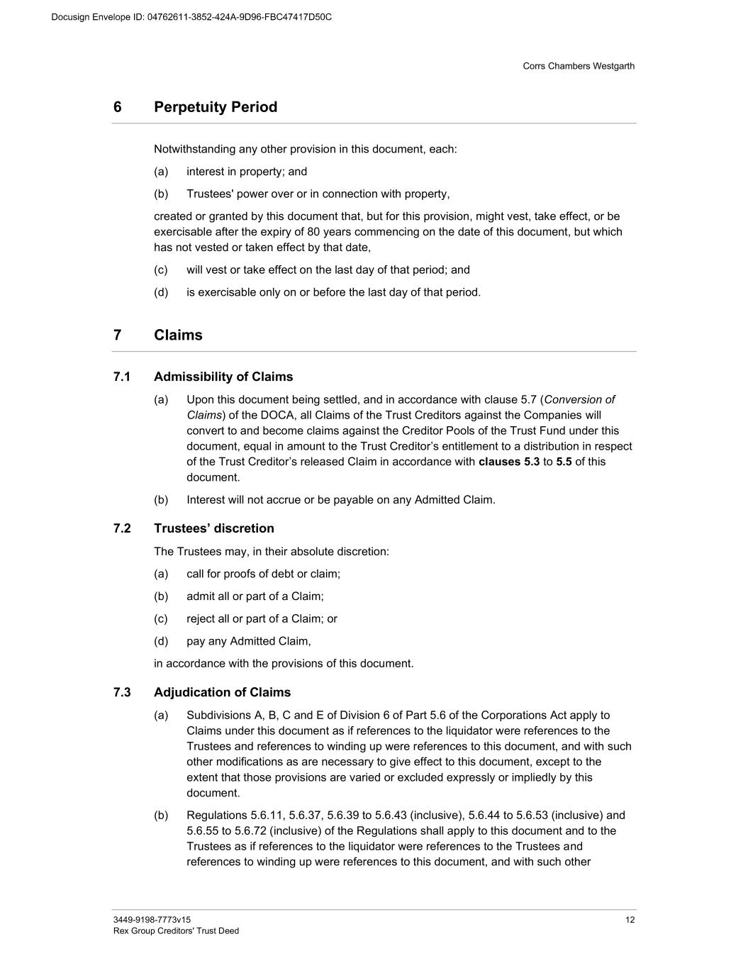 Corrs Chambers Westgarth 3449-9198-7773v15 12 Rex Group Creditors' Trust Deed 6 Perpetuity Period Notwithstanding any other provision in this document, each: (a) interest in property; and (b) Trustees' power over or in connection with property, created or granted by this document that, but for this provision, might vest, take effect, or be exercisable after the expiry of 80 years commencing on the date of this document, but which has not vested or taken effect by that date, (c) will vest or take effect on the last day of that period; and (d) is exercisable only on or before the last day of that period. 7 Claims 7.1 Admissibility of Claims (a) Upon this document being settled, and in accordance with clause 5.7 (Conversion of Claims) of the DOCA, all Claims of the Trust Creditors against the Companies will convert to and become claims against the Creditor Pools of the Trust Fund under this document, equal in amount to the Trust Creditor’s entitlement to a distribution in respect of the Trust Creditor’s released Claim in accordance with clauses 5.3 to 5.5 of this document. (b) Interest will not accrue or be payable on any Admitted Claim. 7.2 Trustees’ discretion The Trustees may, in their absolute discretion: (a) call for proofs of debt or claim; (b) admit all or part of a Claim; (c) reject all or part of a Claim; or (d) pay any Admitted Claim, in accordance with the provisions of this document. 7.3 Adjudication of Claims (a) Subdivisions A, B, C and E of Division 6 of Part 5.6 of the Corporations Act apply to Claims under this document as if references to the liquidator were references to the Trustees and references to winding up were references to this document, and with such other modifications as are necessary to give effect to this document, except to the extent that those provisions are varied or excluded expressly or impliedly by this document. (b) Regulations 5.6.11, 5.6.37, 5.6.39 to 5.6.43 (inclusive), 5.6.44 to 5.6.53 (inclusive) and 5.6.55 to 5.6.72 (inclusive) of the Regulations shall apply to this document and to the Trustees as if references to the liquidator were references to the Trustees and references to winding up were references to this document, and with such other